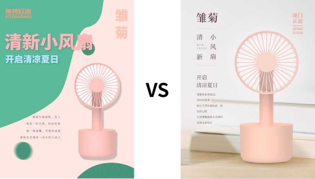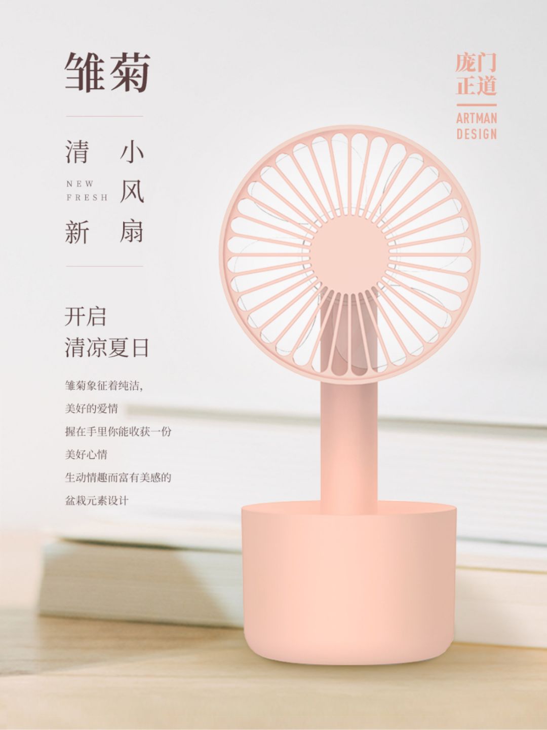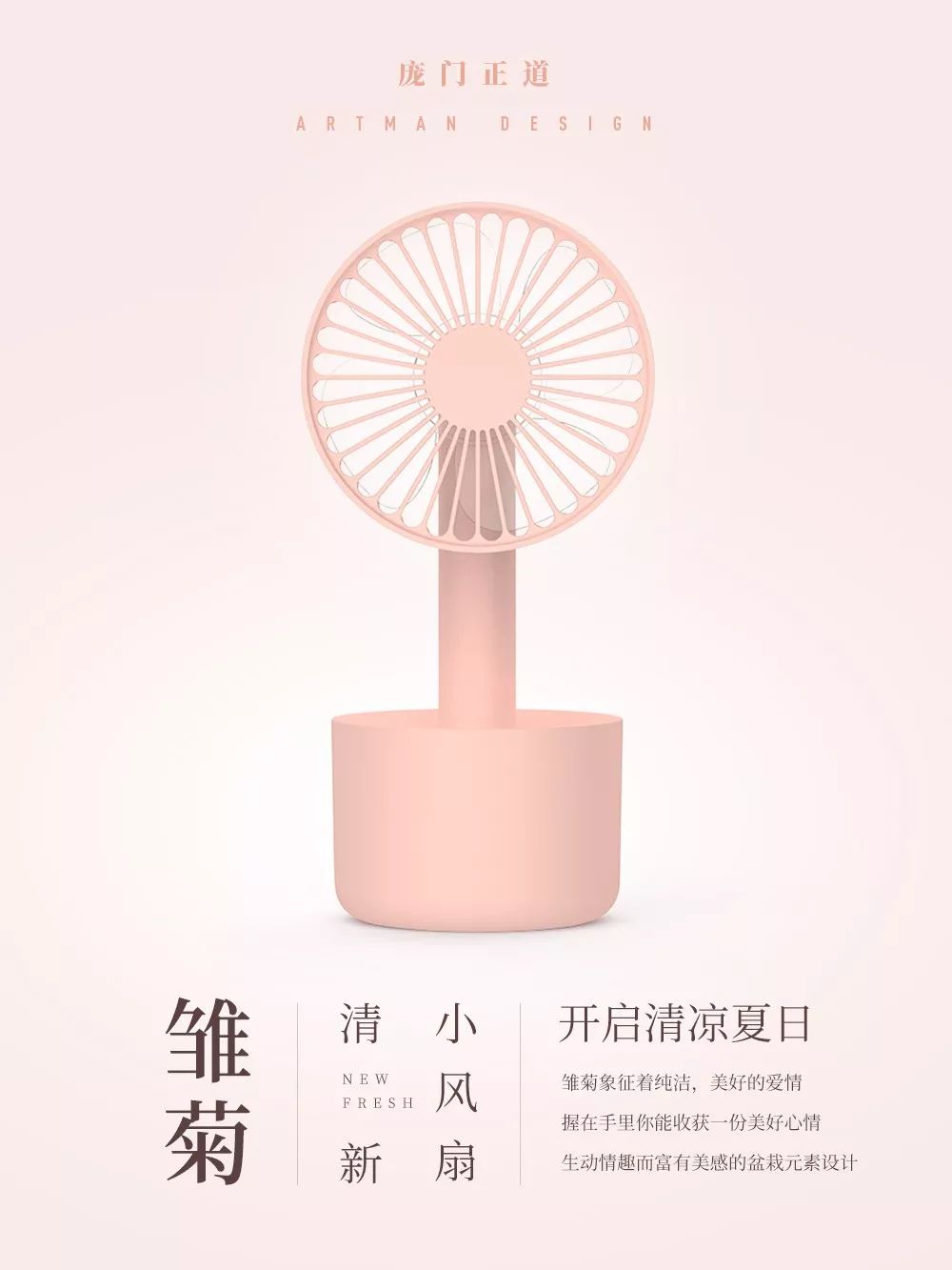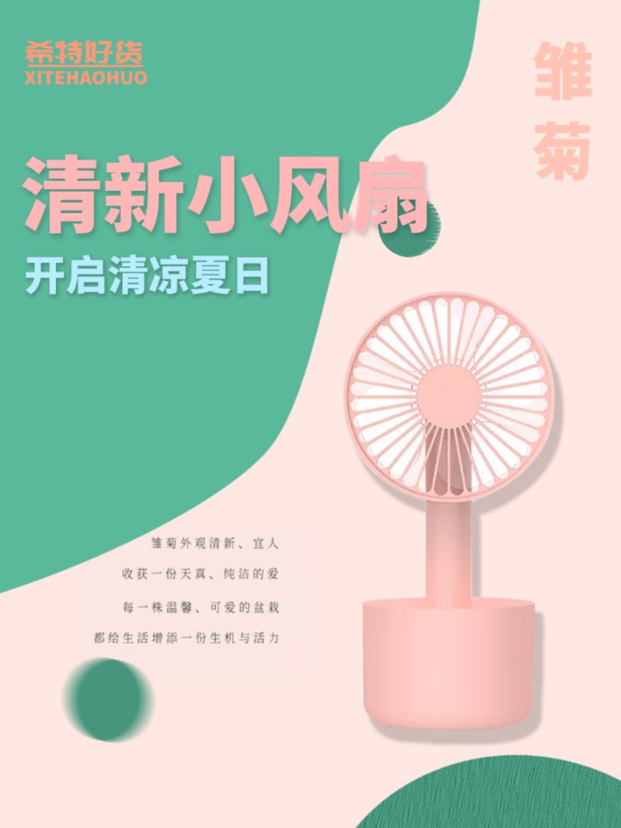 这是一张小风扇的广告,整个画面在颜色上还是挺舒服的,有种清风扑面的感觉。