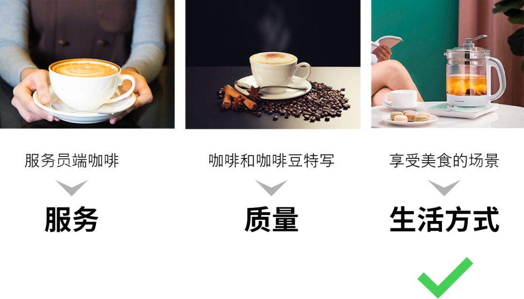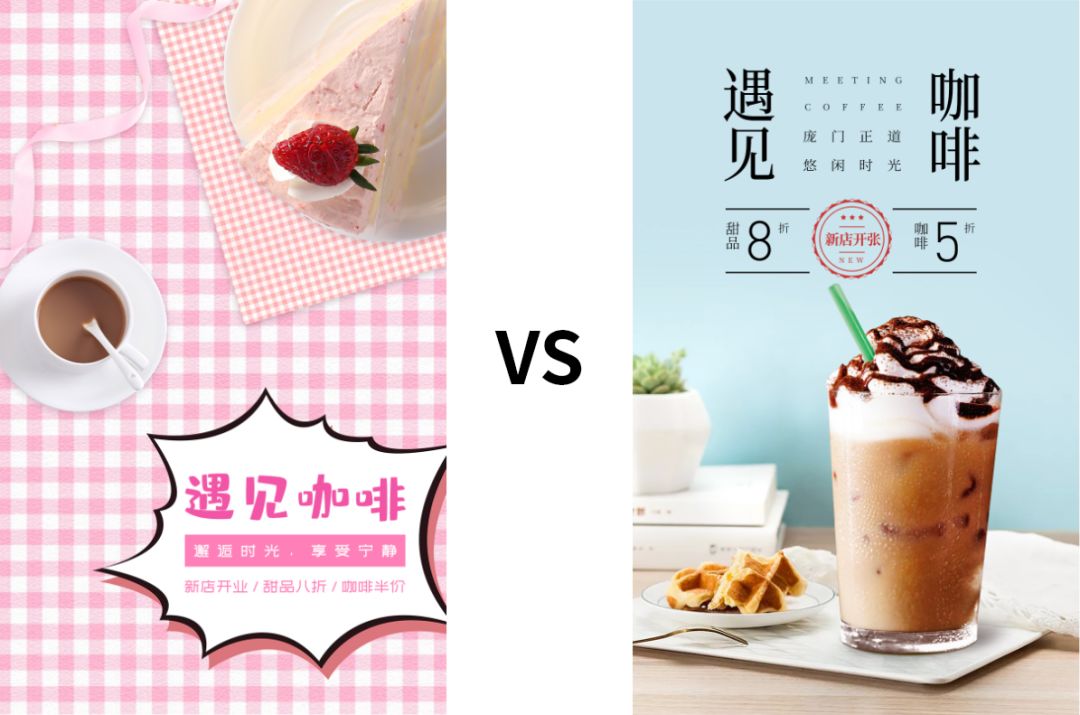 咖啡店给人的感觉应该是小资、文艺、品质感的,而这个画面传达出来的是粉嫩、活泼,在调性上已经背离了。