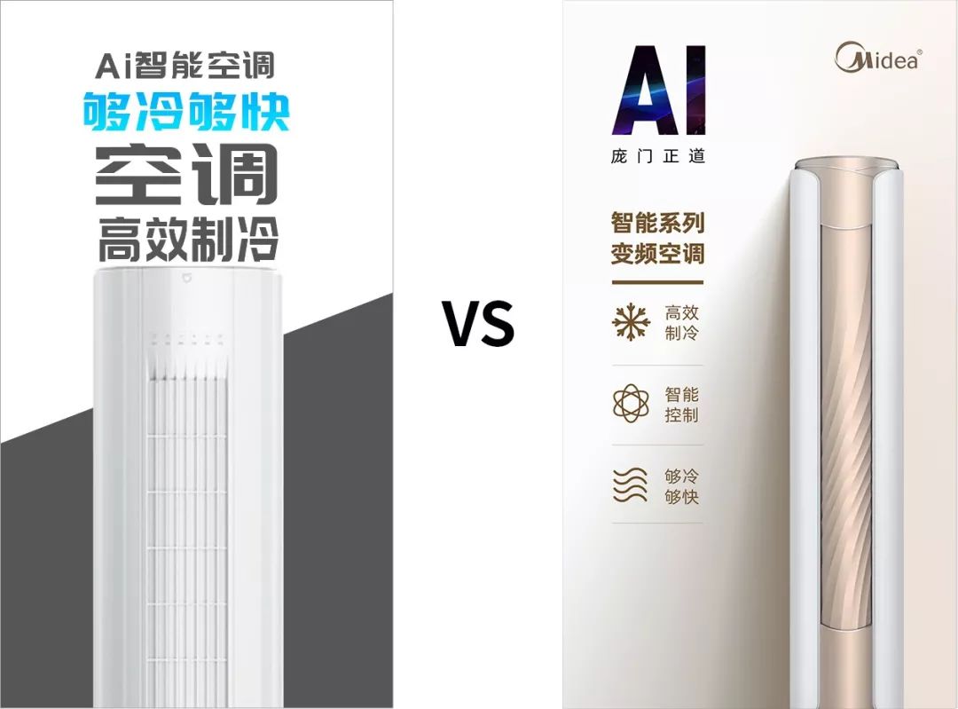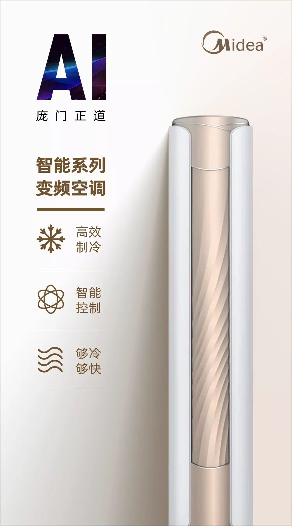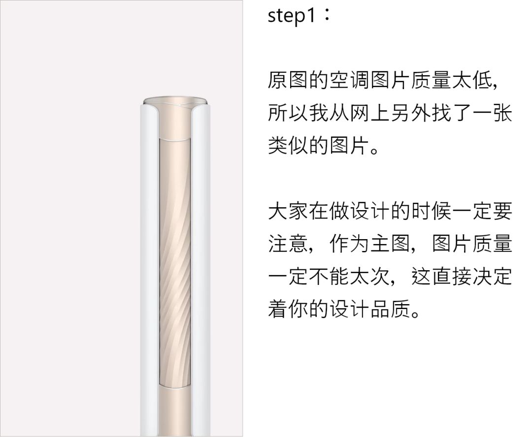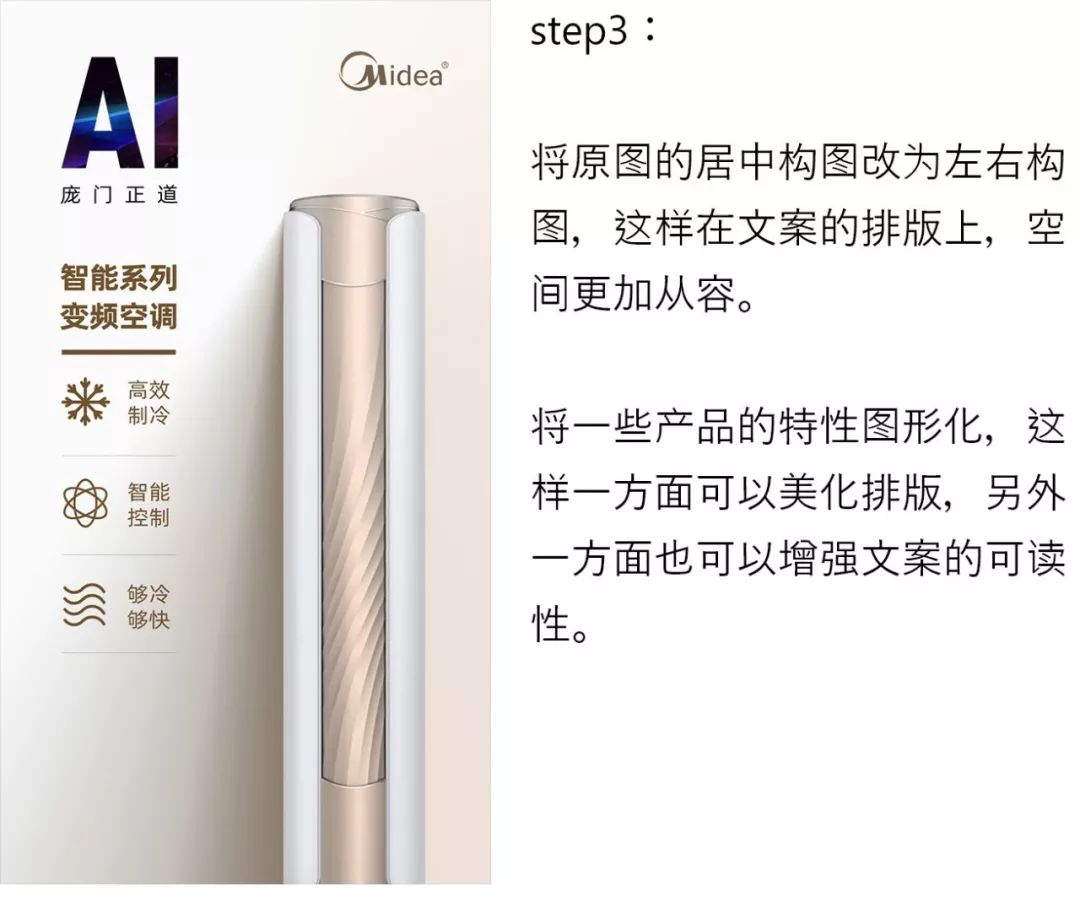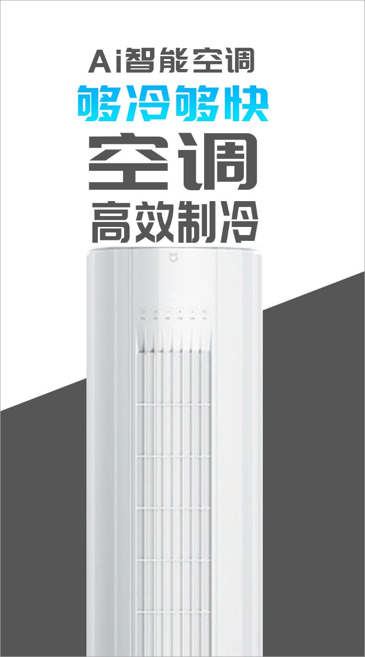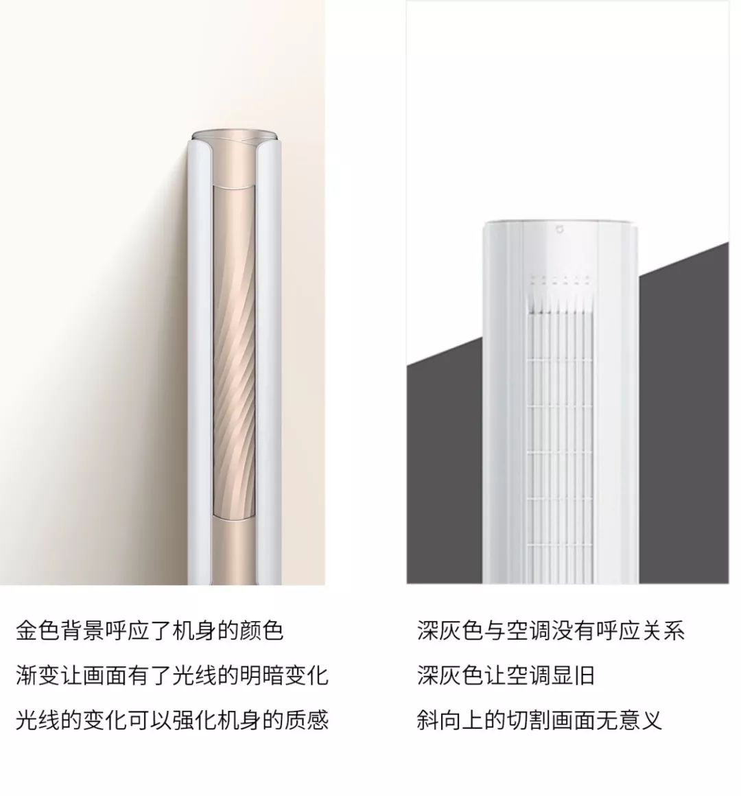 这是一张智能空调的海报。整个海报做成了居中构图,因此显得两边有点空,为了让画面更充实一些,他填充了一个深灰色的背景。
