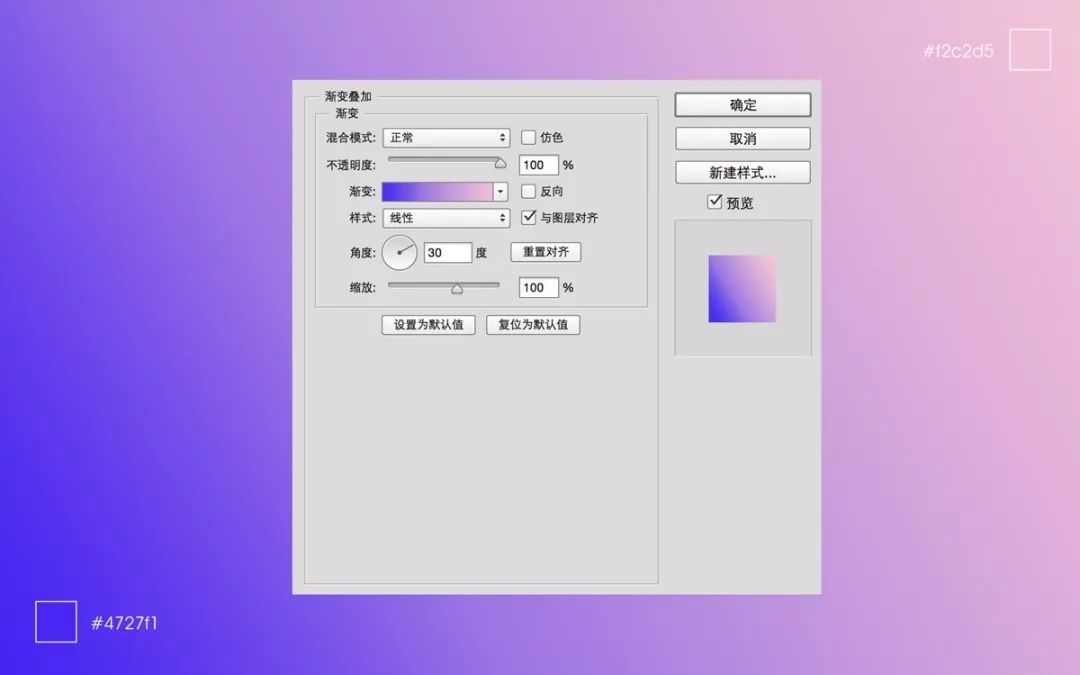 打开Photoshop,新建文件。拉一个炫酷装逼的渐变色,角度如图,然后先吸好深色放在色板中备用。