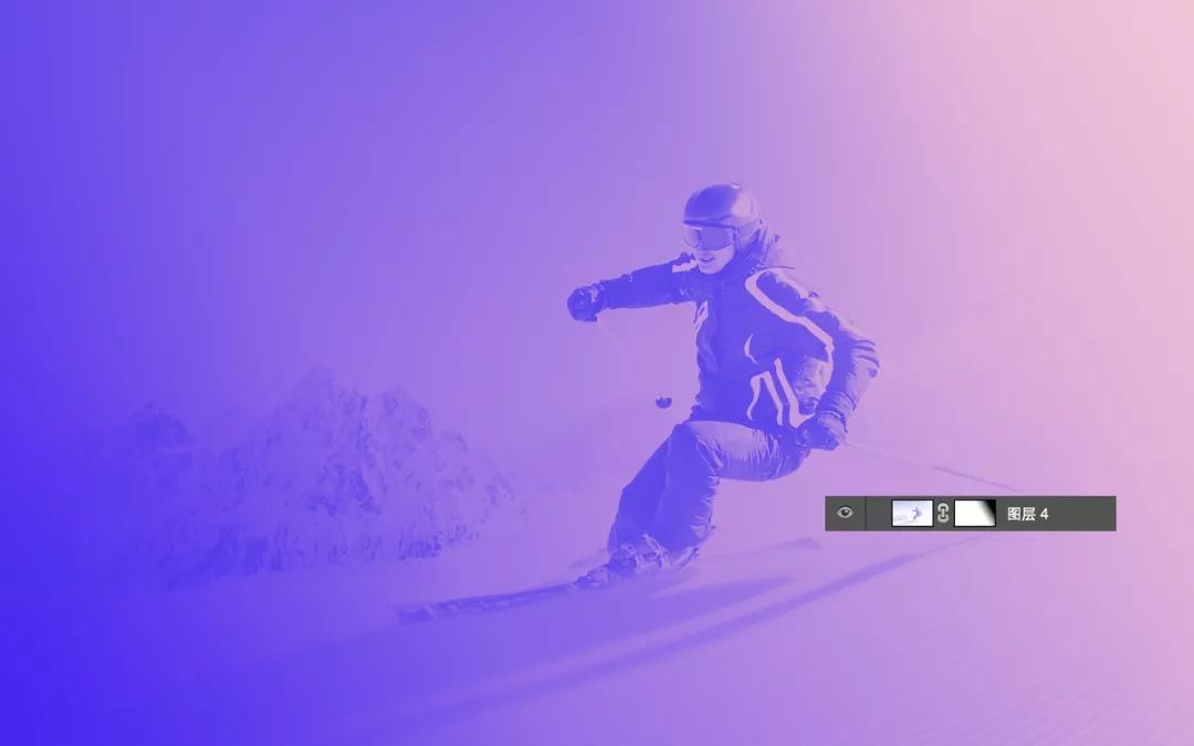 我们可以发现,右上角的填充图层上面的颜色将渐变色的亮色遮挡过多,使得色调不够明朗。这时候我们可以在图层上添加图层蒙版,拉一个渐变蒙板,将让亮色自然地露出来,增强整个画面的双色调对比。