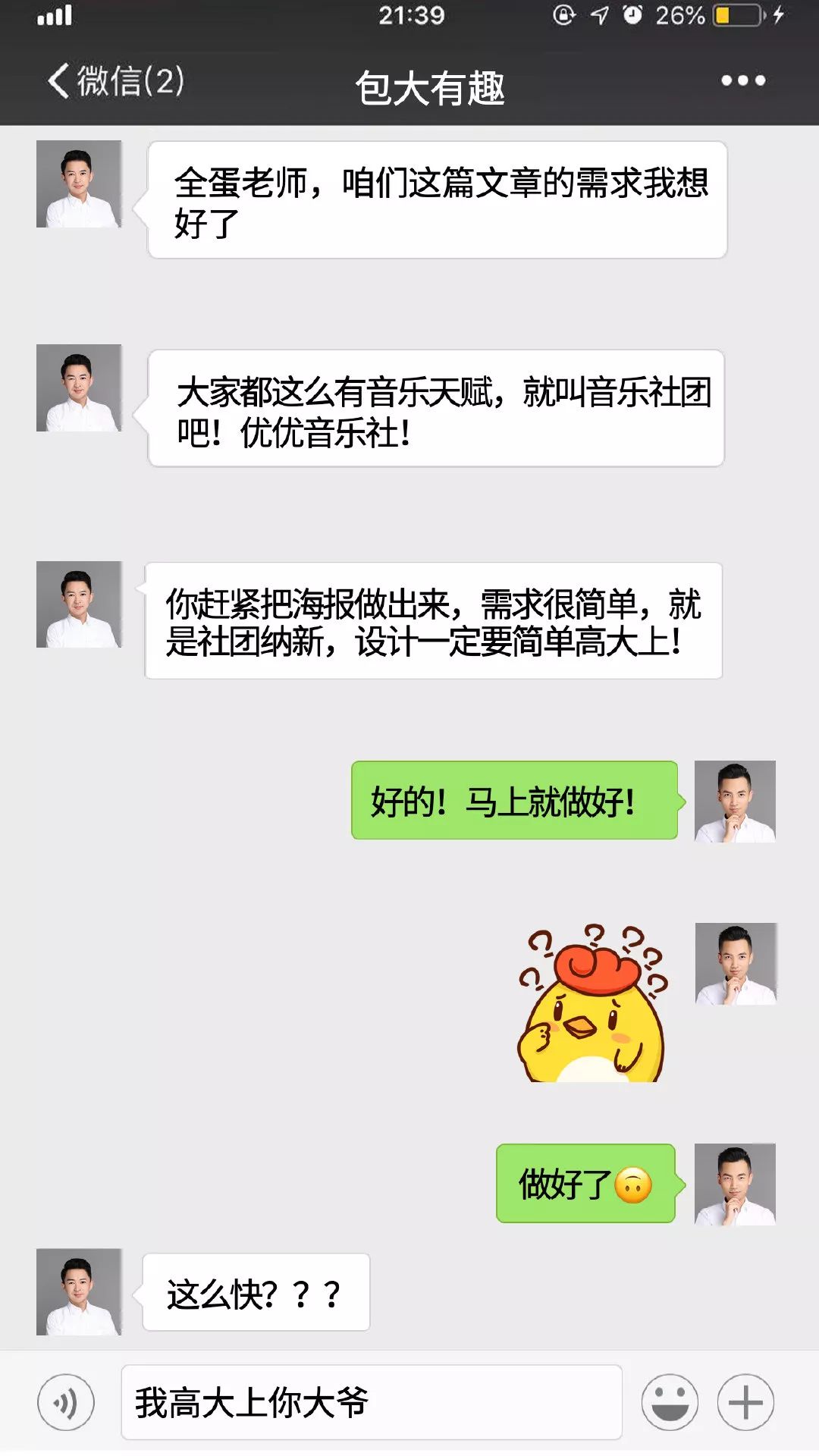 虽然表述简单,但实际还是包含了几个关键信息:音乐社团、纳新、海报、高大上。接下来就需要你根据关键信息,一步步引导你的客户说出真正要的东西。