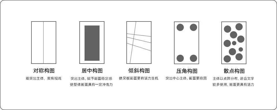 构图的方式有很多,但万变不离其宗。我们在选择构图的时候多数考虑的就是版面的平衡、对比、聚焦、分割等因素,这些都需要你自己在设计的时候,根据信息的多寡、素材的造型、元素的平衡来选择合适的构图,这里没有固定的套路。