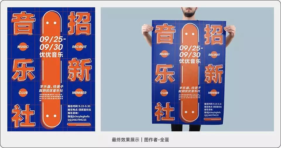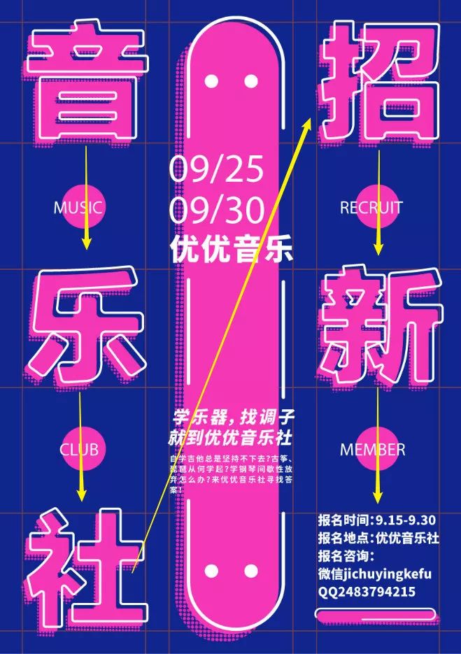 在这张海报里,也只是用了最普遍的文字绕排形式,标题“音乐会招新”五个字依次排开后,正好最后留下的空缺可以放联系方式,这样不仅符合目光移动的路线,而且还解决了标题没有对称导致的失衡问题。而时间信息就放置版面的最中心,这样不管是先看标题还是先看时间,都不会错过关键信息了。