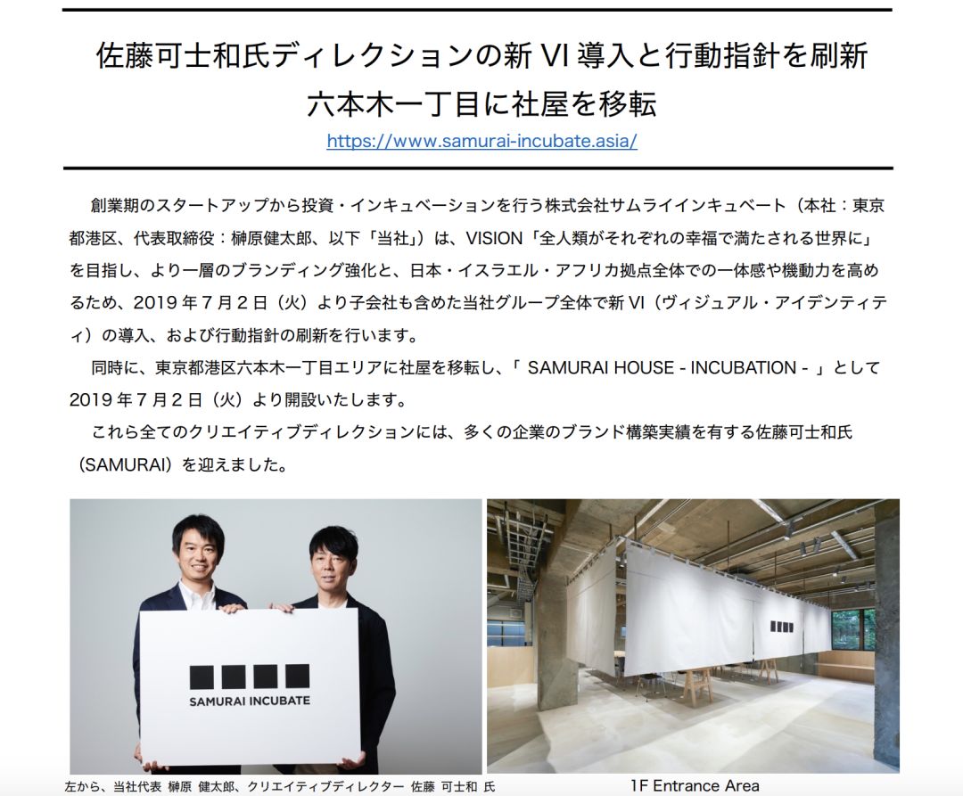 日本风投资本公司 Samurai Incubate 宣布,于7月2日起,在日本的总部换了全新的办公地点,公司网站、名片、信封等将被更新,宣传重新修订的企业品牌形象系统,统一企业理念。