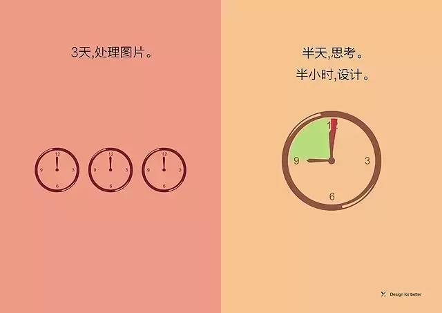 初级设计师用1-3天时间处理图片。高级设计师通常先花半天的时间思考,只花半个小时做设计。