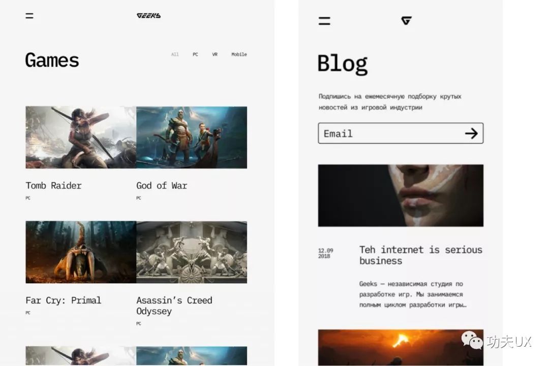 上面两个例子,我们可以发现设计师运用了大空间来设计界面,这使得整个界面呼吸感更强,更透气,因为也是娱乐类偏杂文产品,所以设计会偏艺术化一些。