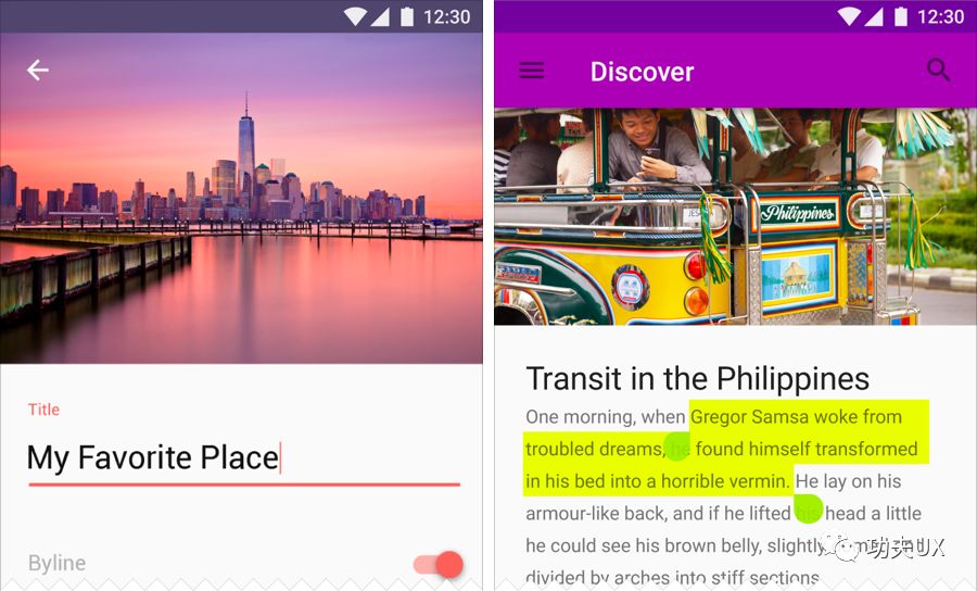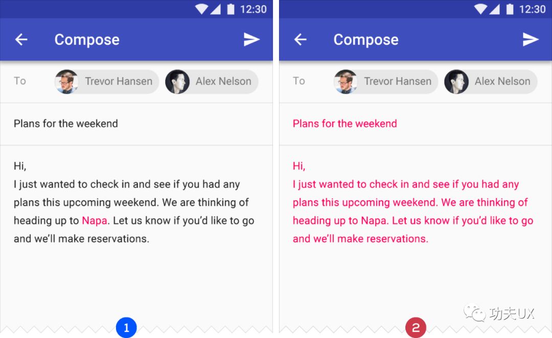 上面两图都在恰当时候使用颜色,比如打开开关按钮,又或者输入文本高亮显示等,右侧只有在选择文本阶段,使用颜色提示