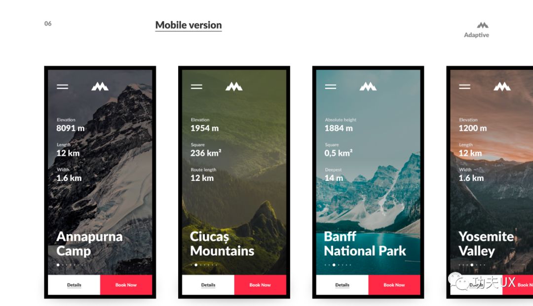 上面案例中算是大小方法上运用比较好的,我们可以看出视觉层次非常清晰了,首先我能快速知道哪些重要信息,肯定是封面图,接着左上角logo,然后就是导航和标题了,最后就是针对每个内容块的一些详细文案解释。