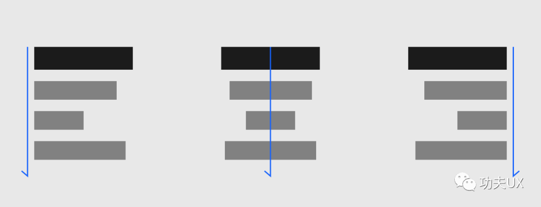 界面设计中,可以有三种思路对齐,当然根据业务板块去选择合适的对齐方式,三种对齐方式都有一个隐形的轴(看我标的线),然后围绕这个去排版设计,自然形成一个规则的视觉流