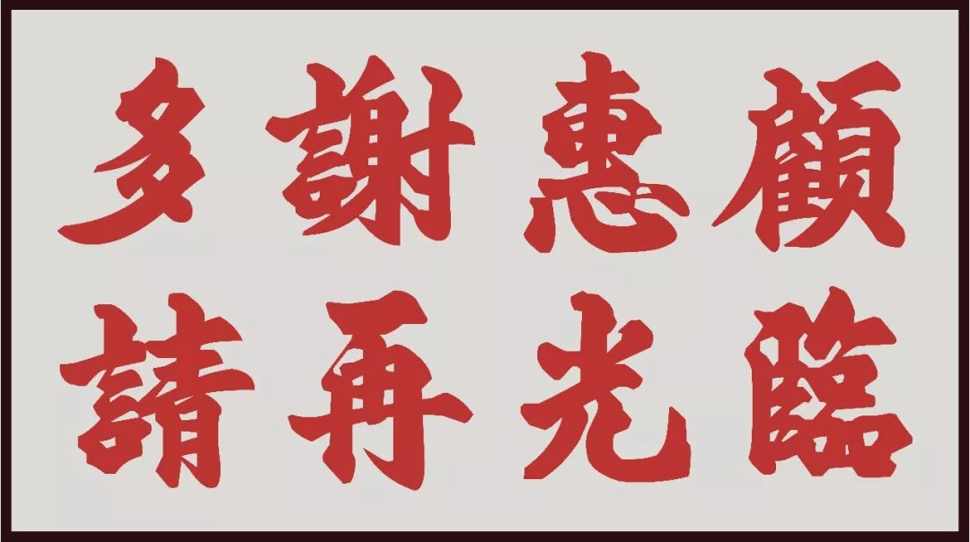 北魏体结合碑帖的优点,令字型呈梯形或三角形,可以更稳重地悬挂于招牌上。北魏体看上去很精神、挺拔,从远处也能清晰可见。区建公的书法有力,起笔、收笔以及转折处的夸张,令字形容易辨认且极具风格。