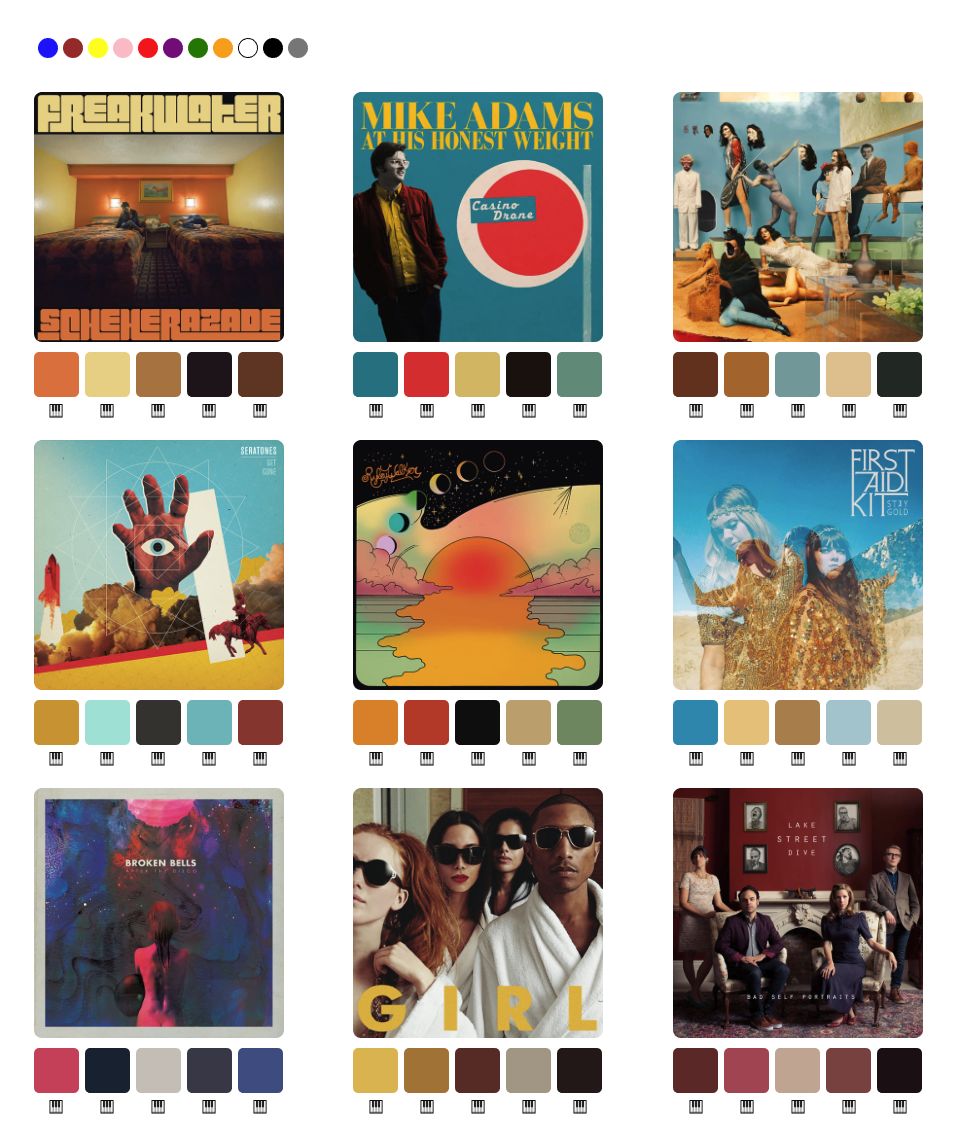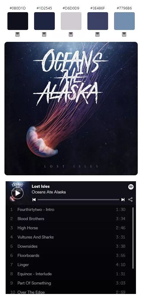 最后给你们介绍一个网站,里面都是音乐专辑的封面,以色卡的形式呈现,你可以一边看封面,一边取色,一边听歌,做设计不要太爽哟!