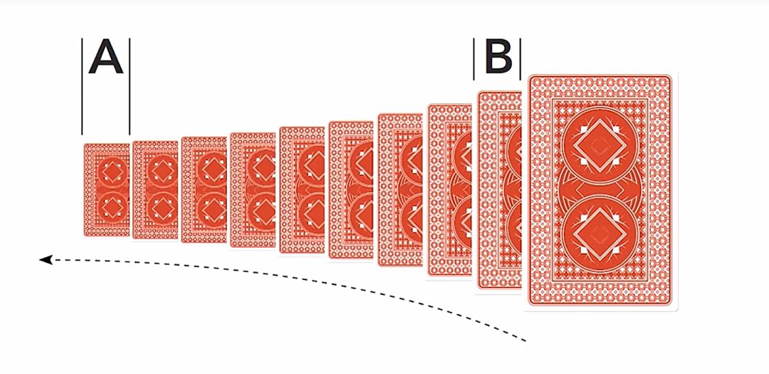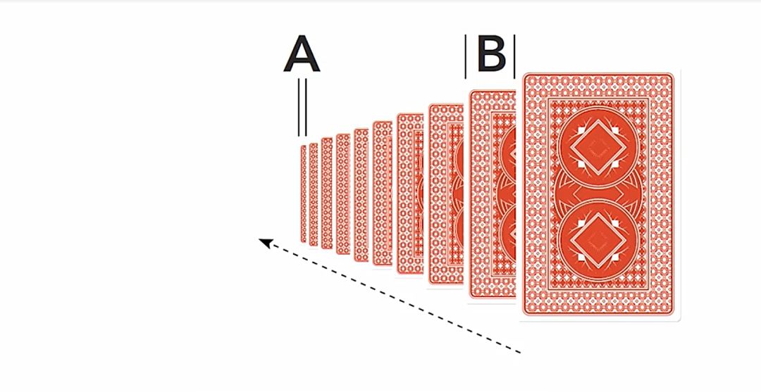 这是一副从前往后依次排列的纸牌。如果纸牌中每一张的显示量都少了一些,那么随着它逐渐变小,你会感觉到,在这里有一条直线的存在。