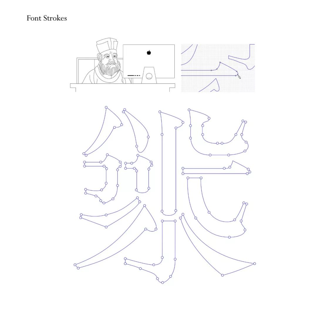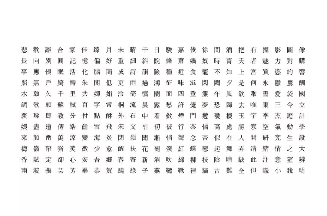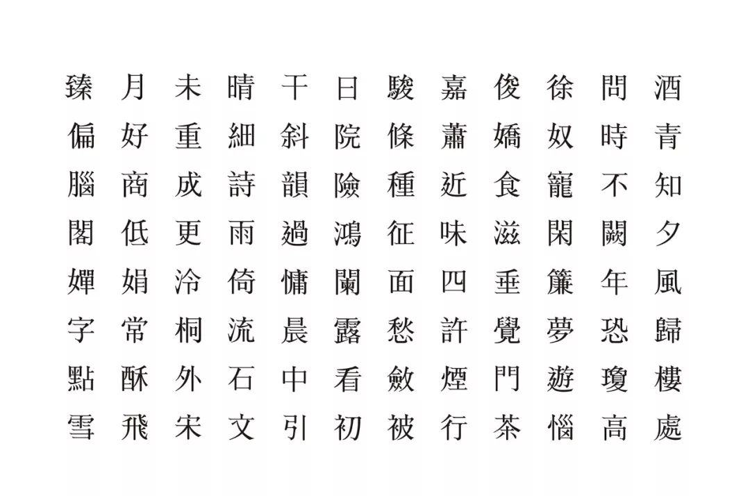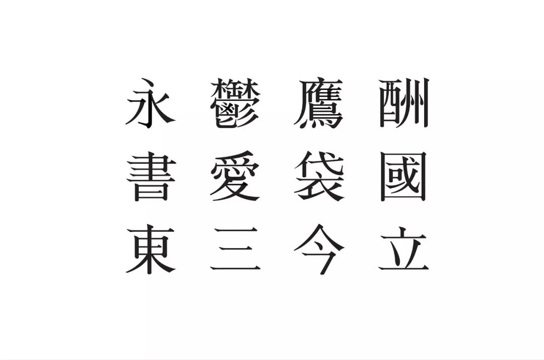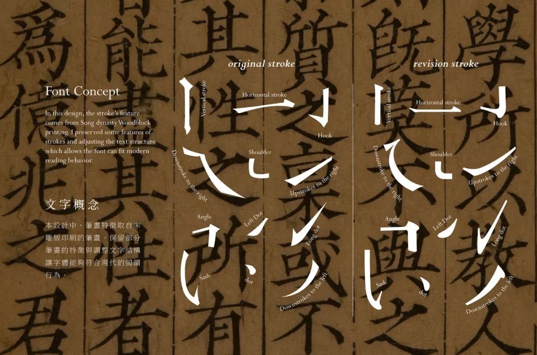 本设计中,笔画特征取自宋雕版印刷的笔画。保留部分笔画的特征与调整文字结构,让字体能符合现代的阅读行为。