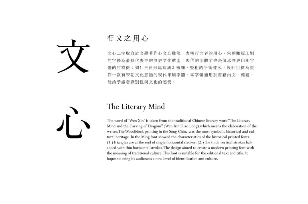 文心二字取自于文学著作心文心雕龙,表明行文者的用心。宋朝雕版印刷的字体为最具代表性的历史文化遗产,现代的明体字也是传承历史印刷字体的特征:如1.三角形尾端与2.横细、竖粗的平衡样式。设计目标为制作一款有宋朝文化意涵的现代印刷字体。本字体适用于书籍内文、标题,能给与读者识别性于文化的感受。