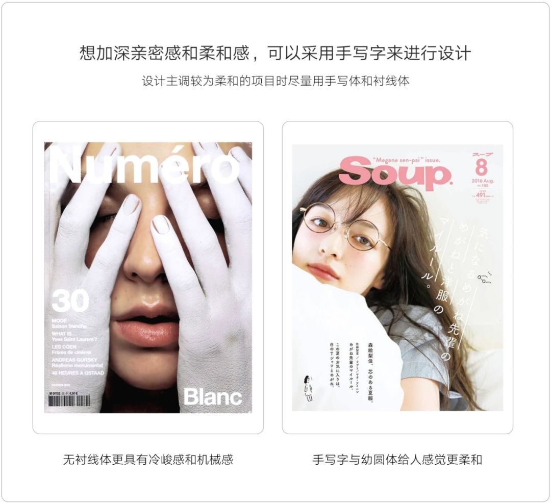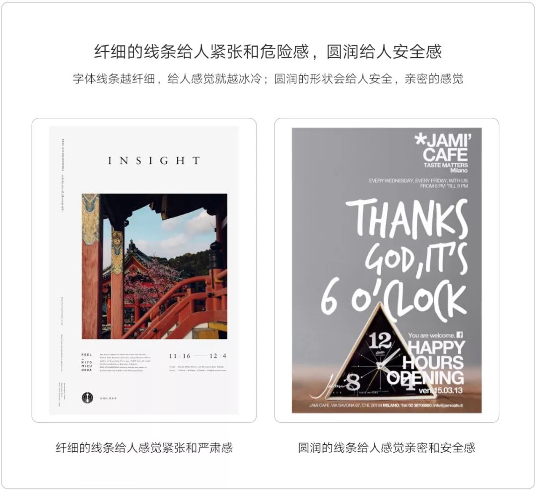 字体越纤细,前端越尖锐,就越让人难以靠近。相反,线条粗大,前端越圆润的字体,会给人一种安全、亲密的感觉。