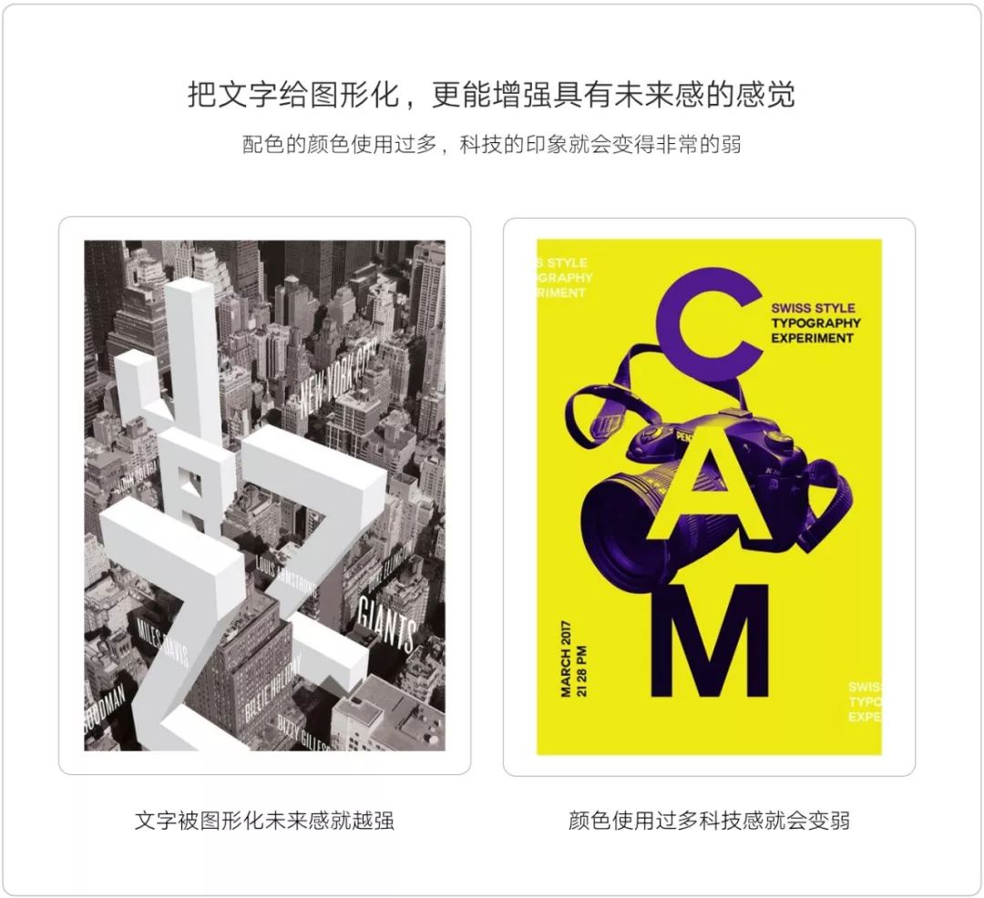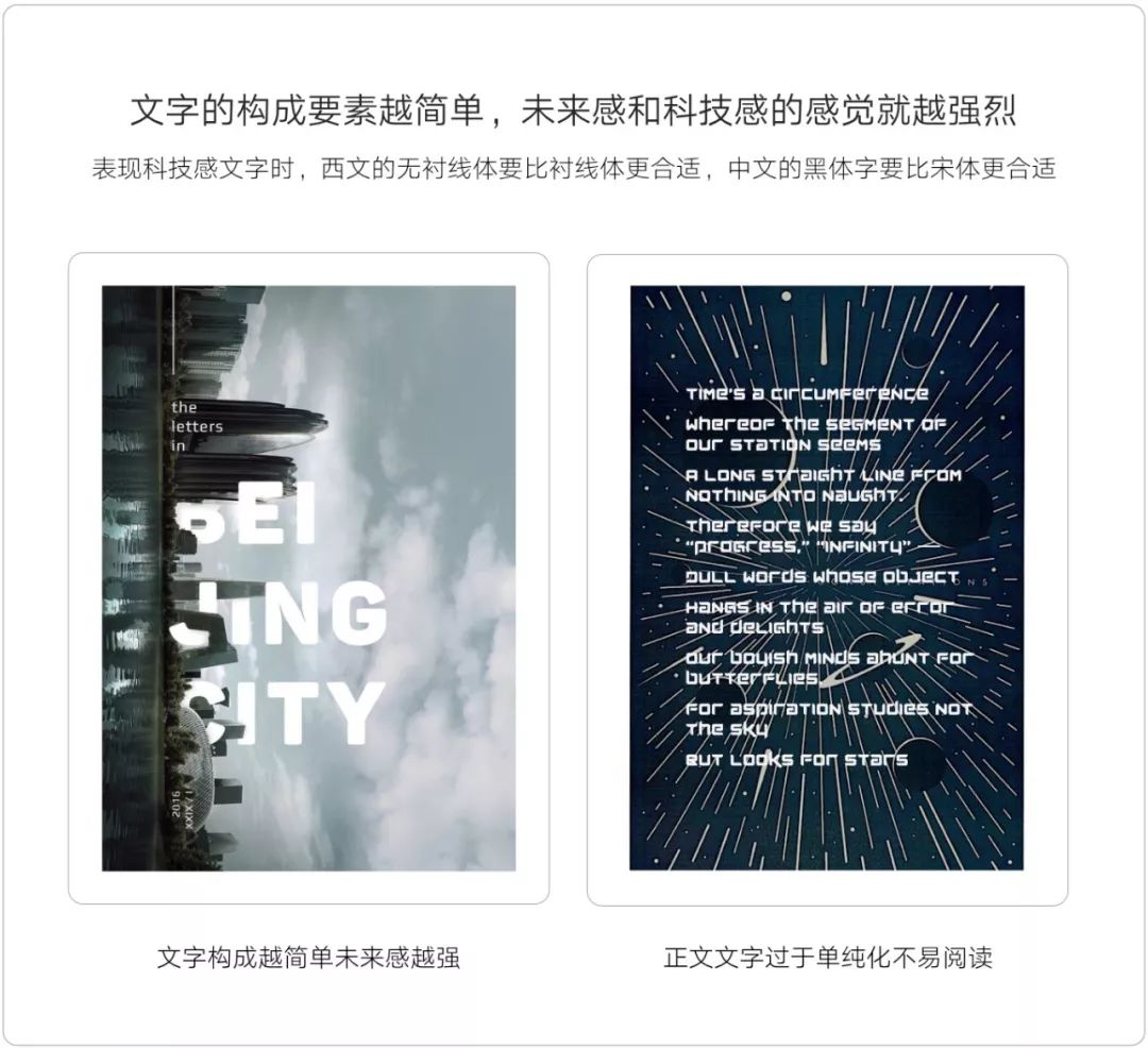 文字的构成要素越简单,未来感和科技感就越强烈。无衬线体(黑体)要比衬线体(宋体)更合适。