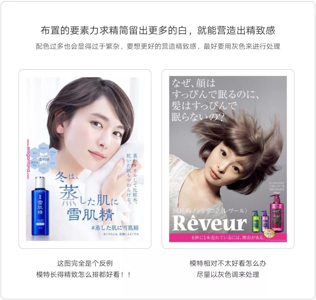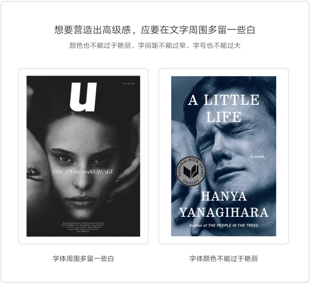 另外想要营造出“高级感”,字号不能过大,还要在文字周围多留一些白,配色也不能过于艳丽,要降低明度与纯度。