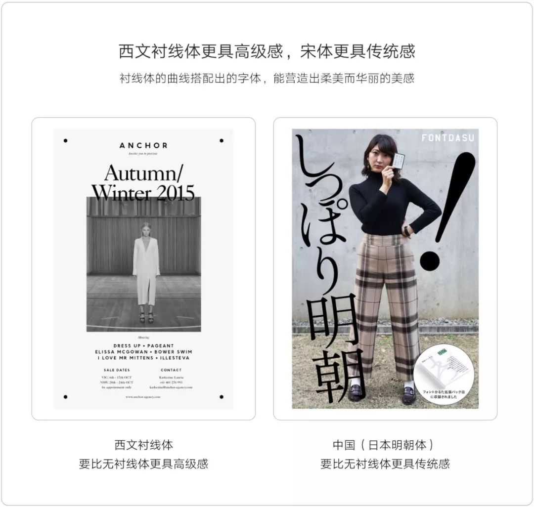 字体结构中,西文的衬线体比无衬线体更有高级感,而中文宋体要比黑体字更有传统感。