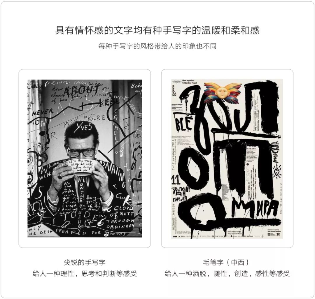 选择字体时要清楚那个时代的文化特色,巧妙地掌握趋势走向。一般来说具有“情怀感”的文字,均有种手写字的温暖和柔和感,而尖锐的字体会给人一种理性,思考,毛笔字会给人一种洒脱,随性的感觉。