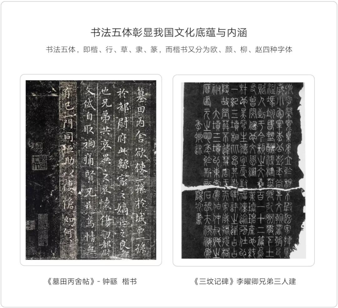 我国历史文化源远流传,具有代表性的传承是书法五体,即楷、行、草、隶、篆,而楷书又分为欧、颜、柳、赵四种字体。