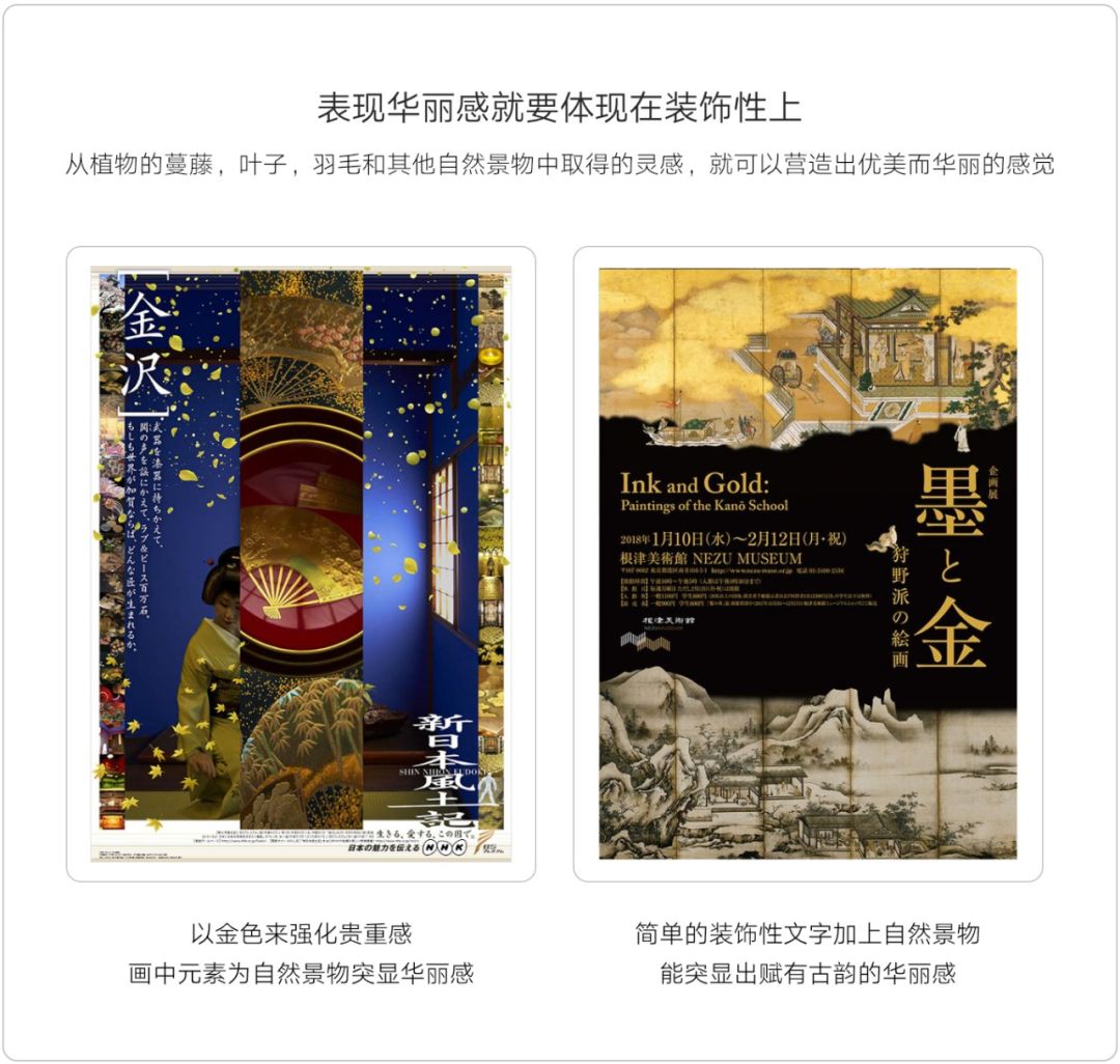 从植物的蔓藤,叶子,羽毛取得灵感,再把它们融入设计中,就可以营造出华美的感觉,但要注意文字的识别性。