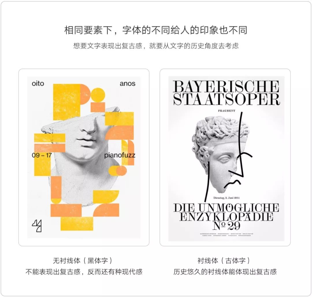 想要文字表现出复古感,就要从历史角度去考虑,用具有文化气息的衬线体和历史悠久的字体更为合理。另外使用复古元素搭配衬线体,也能画龙点睛。