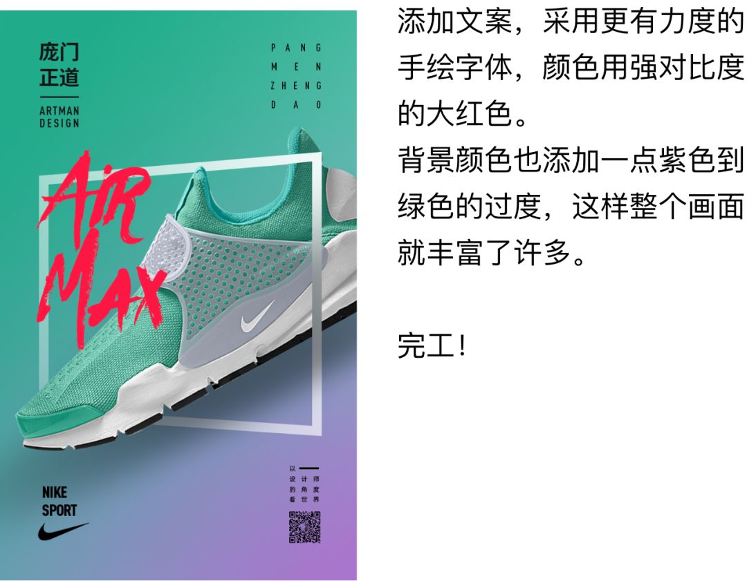 最后再调整下文案和背景的颜色细节,增加绿色到黄色的过度让画面看起来更有活力,最后将其它文案排版好,就完工了!