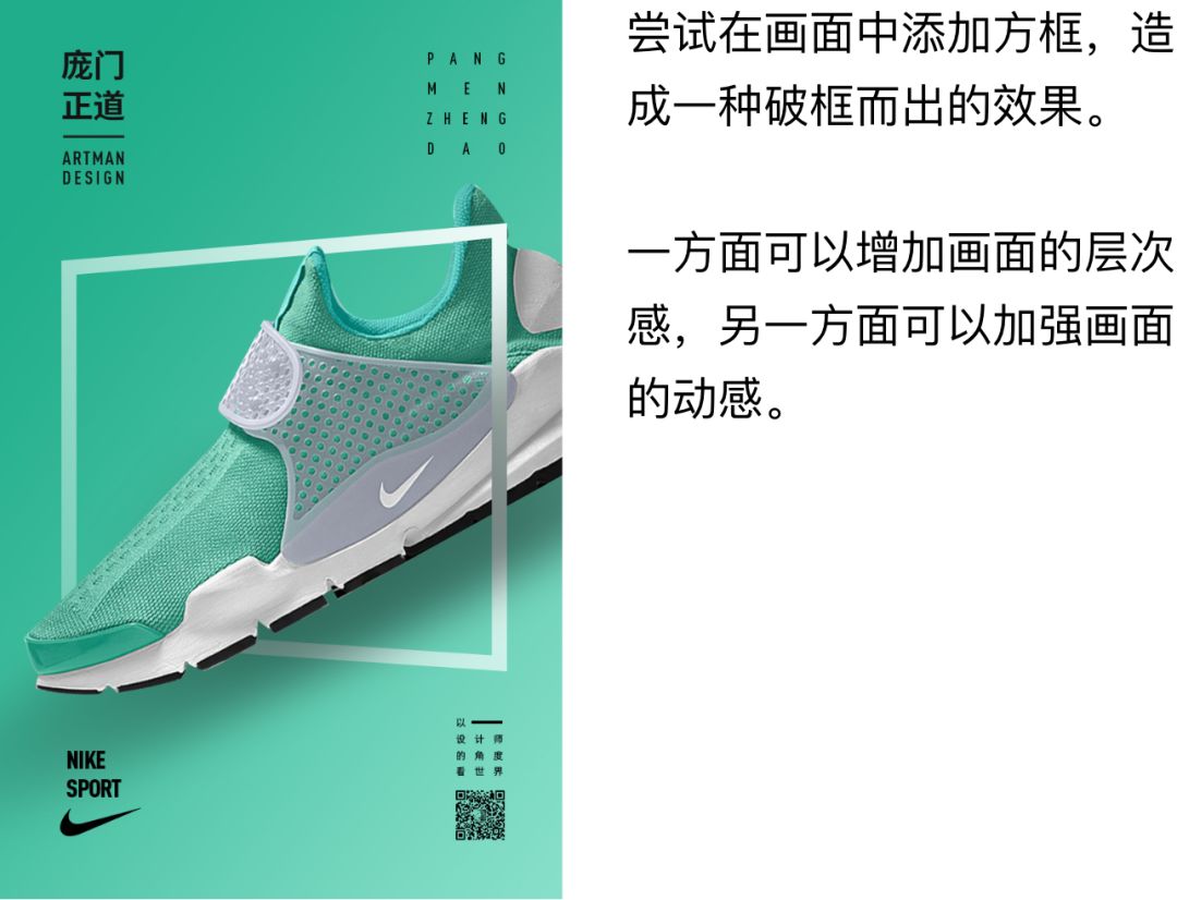 一只鞋歪了,平静的排版被破坏,画面就动起来了。