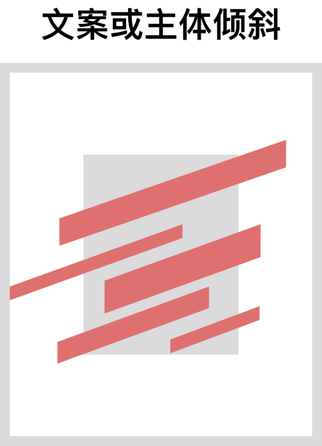 这种局部倾斜在整体上在视觉上是比较稳的,只要将主要的文案或者视觉元素倾斜就行。