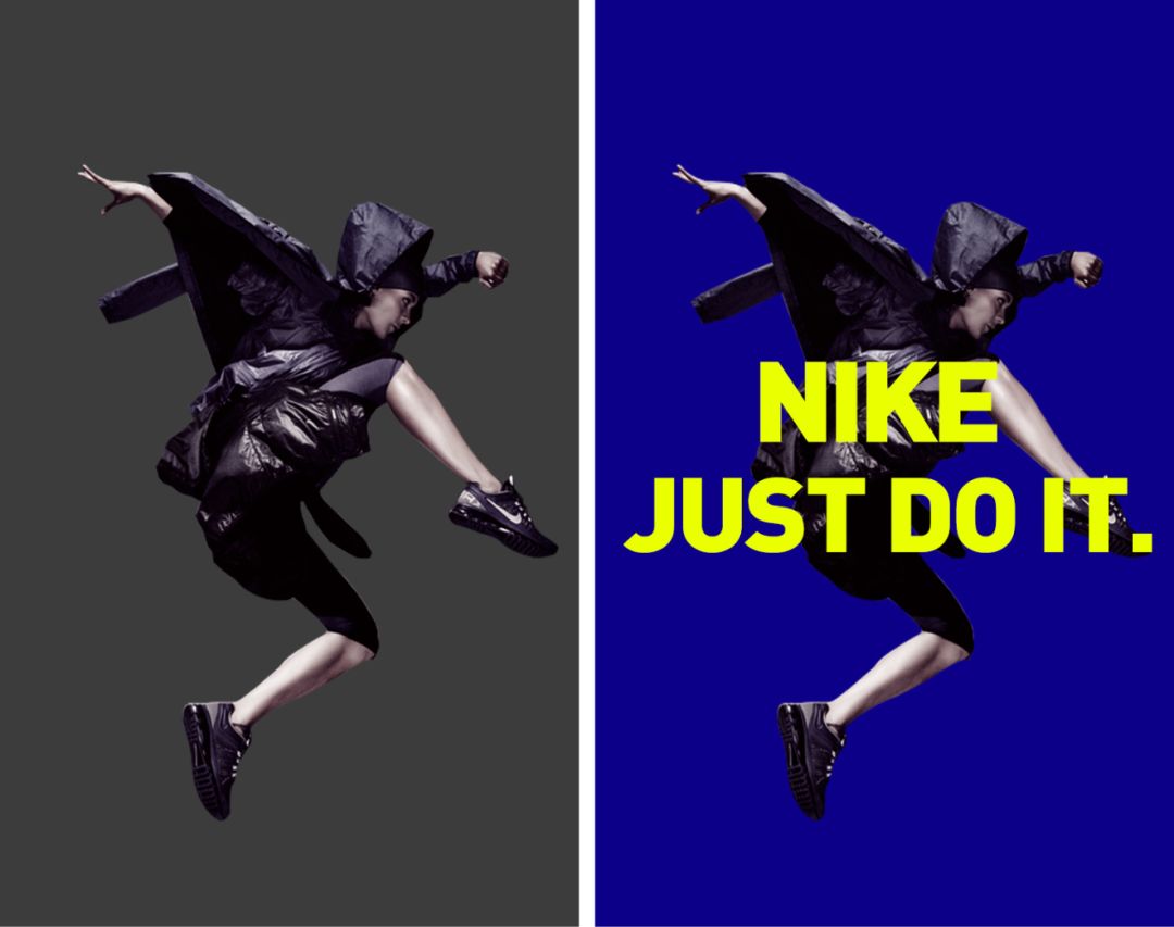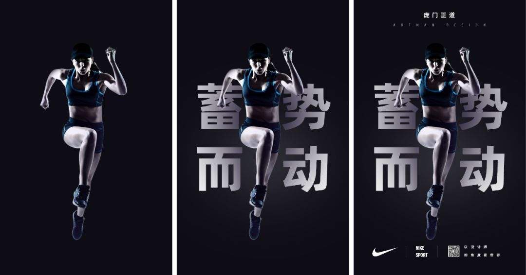 然后尝试将文案倾斜,再结合人物的肢体动作,跟文案作前后叠压处理。如下图所示: