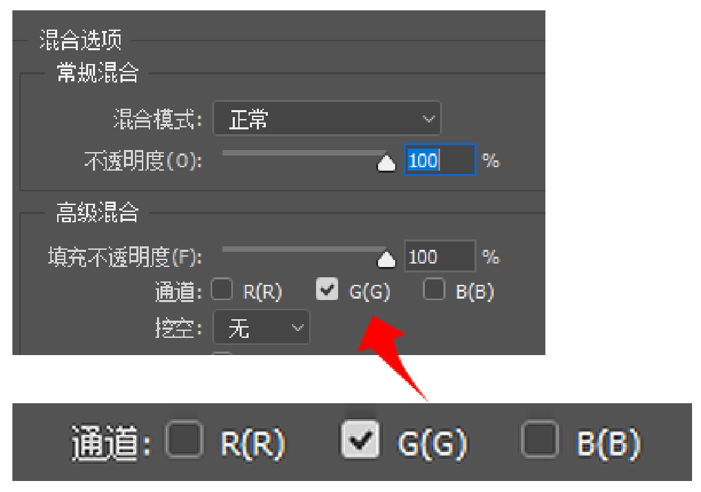 第一步,复制一层,然后调出“图层样式”面板,在通道那里只勾选其中一个通道。
