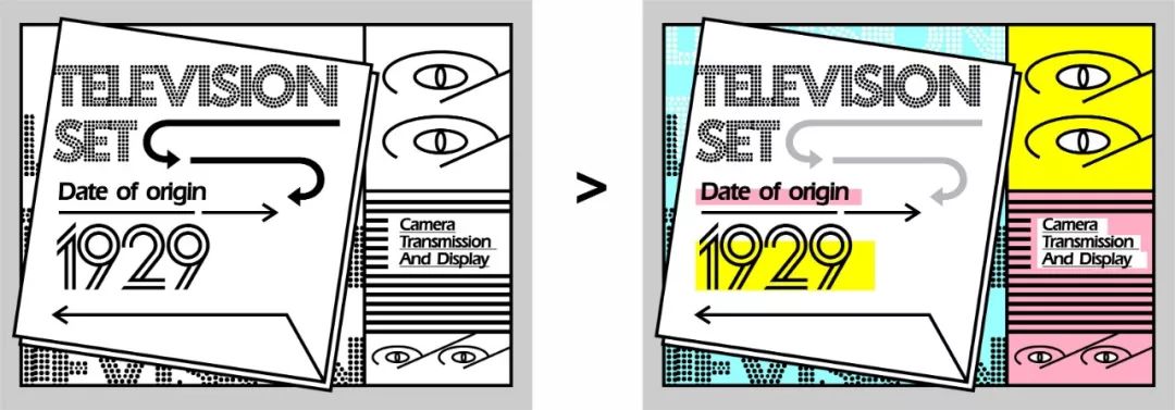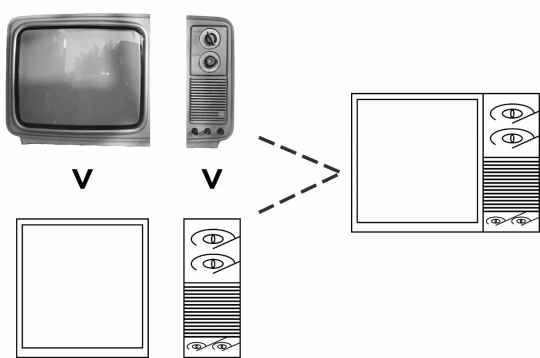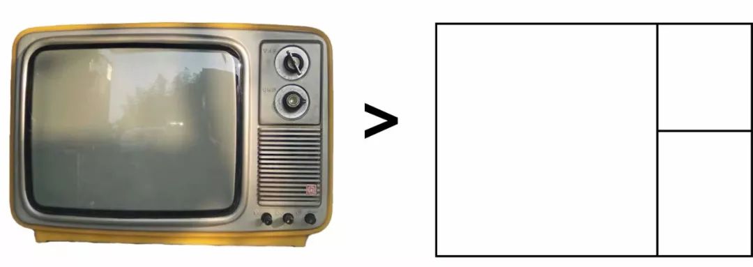 那色彩、线条呢,也可以去灵活变通。首先我们简化一下外形特征,提取核心,将电视分成三个矩形。