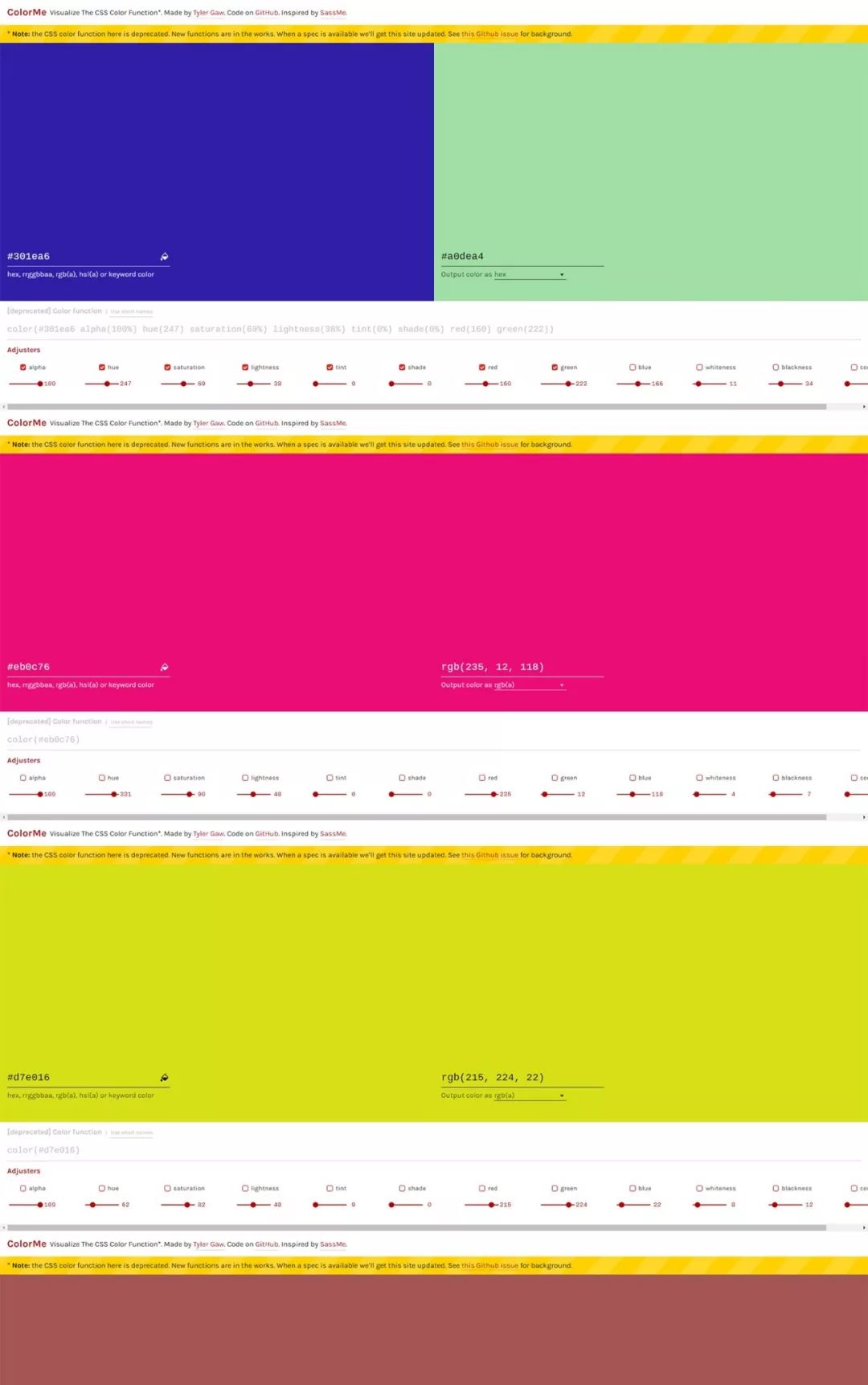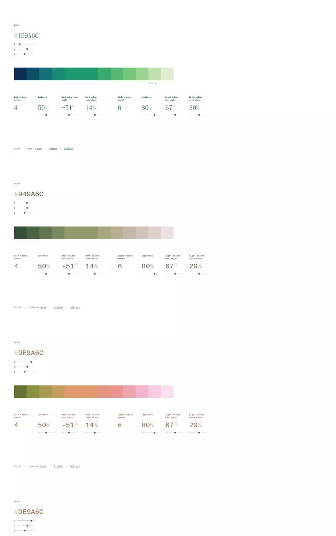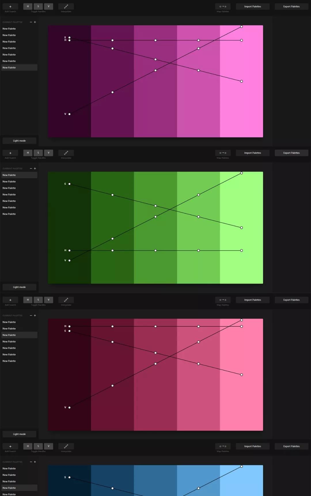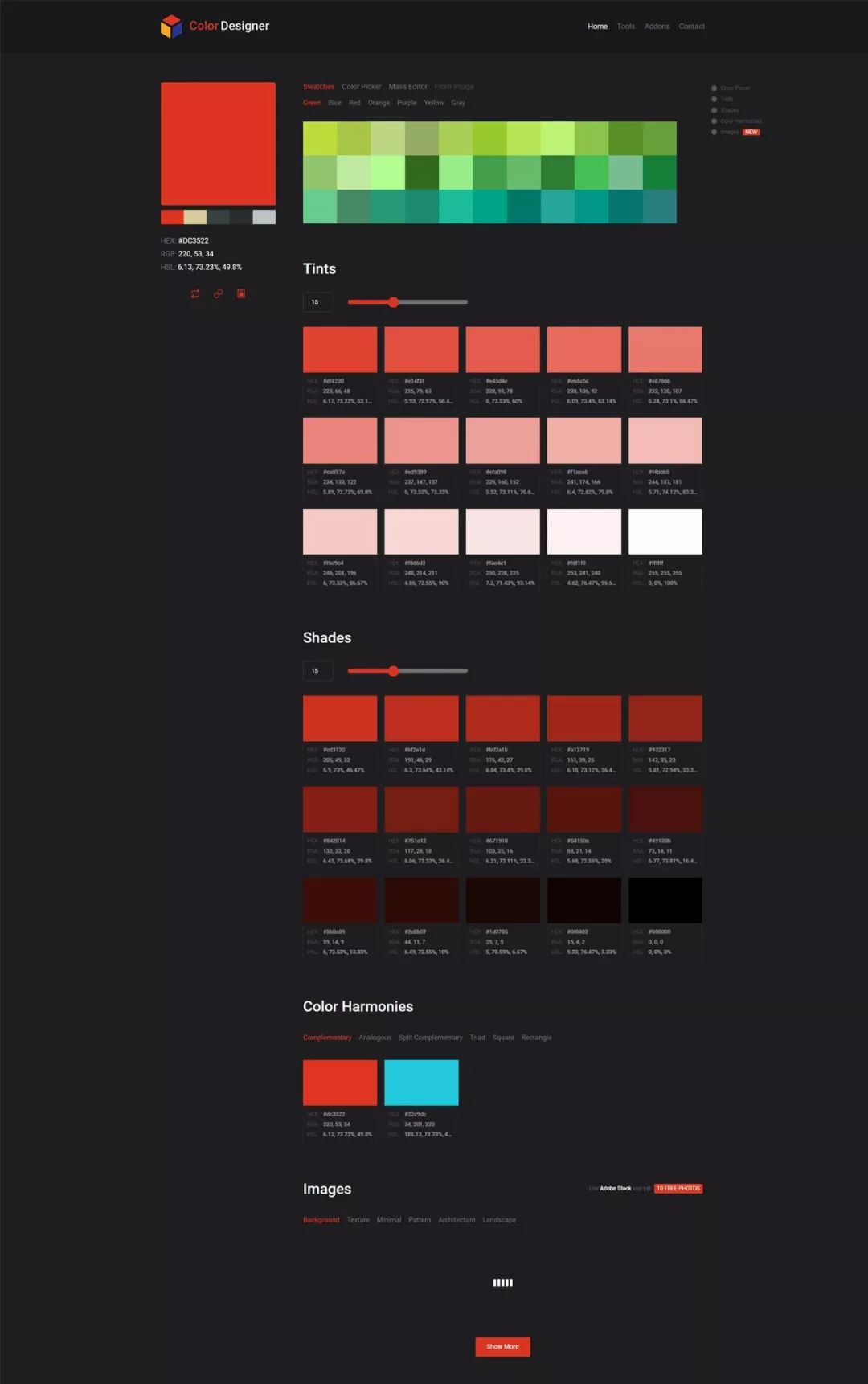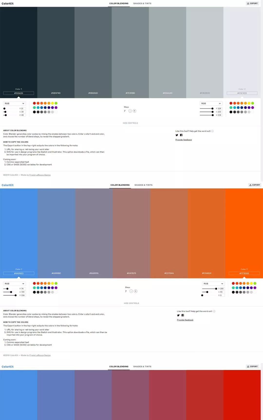 此工具的主要目的是帮助构建调色板并基于它生成色调和阴影。只需选择一种颜色,应用程序完成其余的工作。您可以使用预选颜色或颜色选择器进行更多控制。