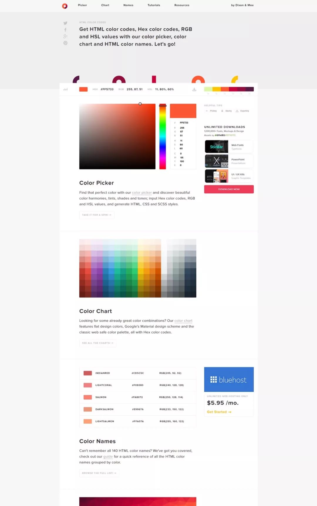 使用我们的颜色选择器,颜色图表和带有Hex颜色代码,RGB和HSL值的HTML颜色名称,轻松查找网站的HTML颜色代码。