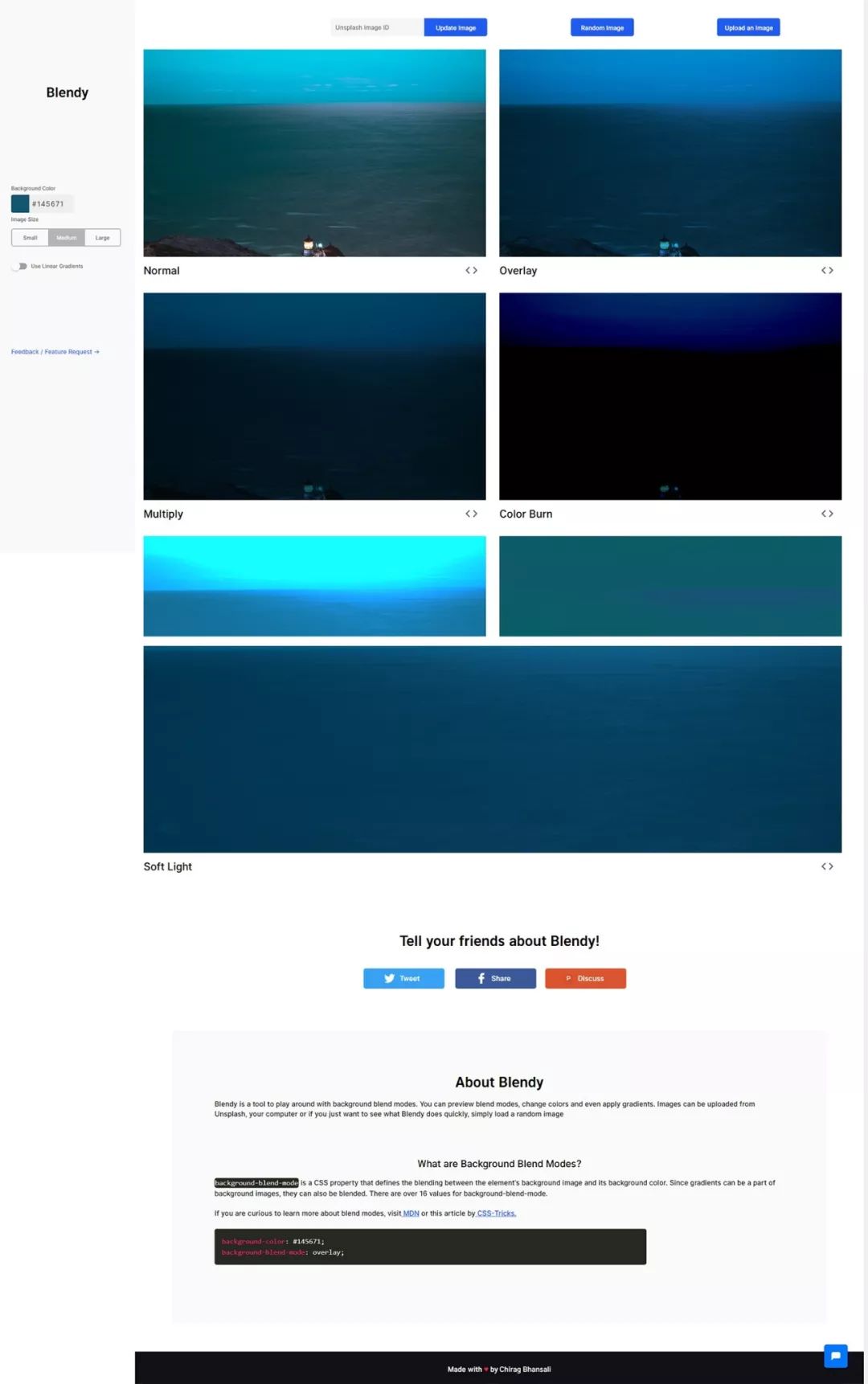 Blendy是一种快速预览CSS背景混合模式的工具。您可以使用混合模式,颜色,渐变并在图像上进行尝试。