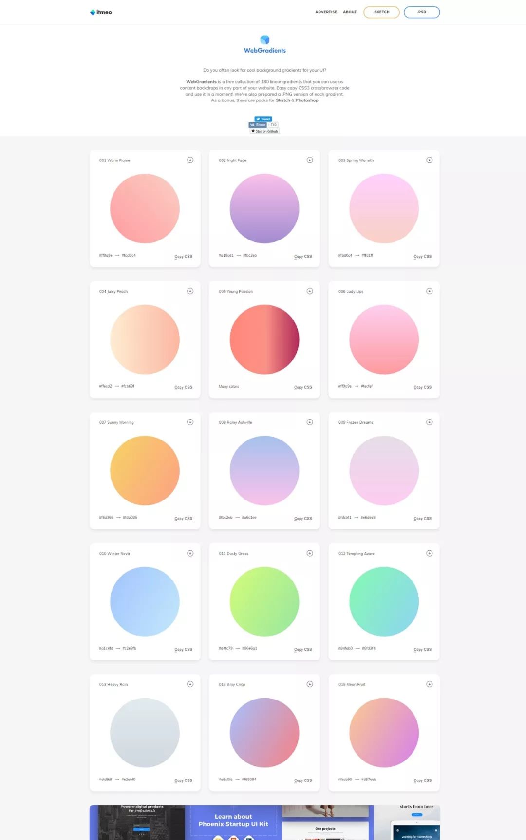 来到WebGradients.com,获得CSS3,Photoshop和Sketch中180个漂亮的线性渐变。此系列由顶级设计师策划,完全免费。