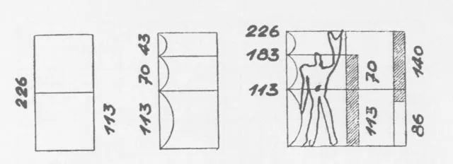 利用113的尺寸产生黄金比70,由此得到红尺:4-6-10-16-27-43-70-113-183-296等。