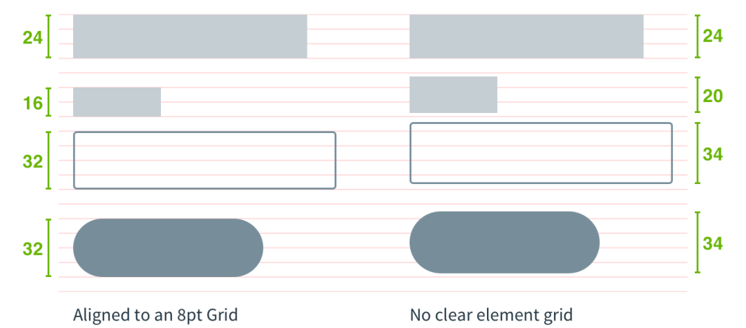 建立8点为一个单位的网格,所有的元素尺寸都是8的倍数。使用 8 的增量来确定页面上元素的大小和空间。界面设计中的边距或填充都是 8 的增量(倍数)