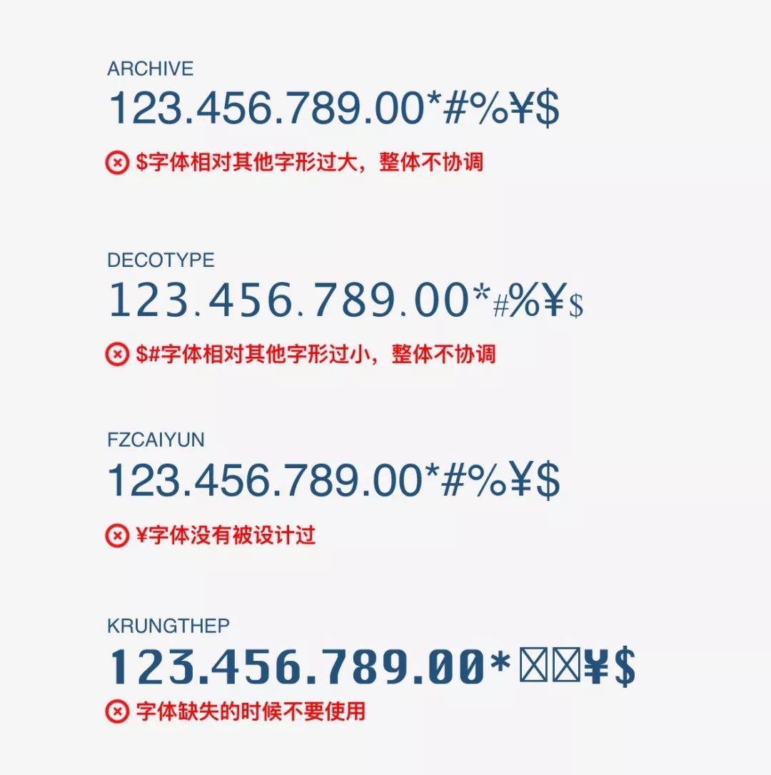 ▲ 通常我们很多时候,网上去免费找一些数字字体,或者选择几款热门字体时候,一定需要注意检查“$”和“%”“¥”符号。