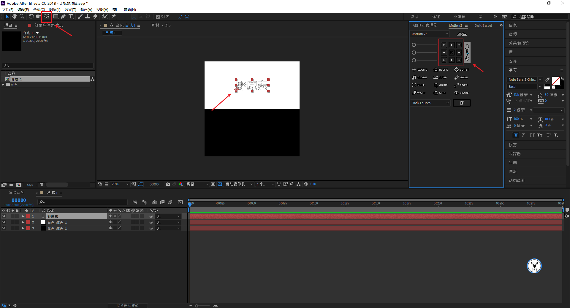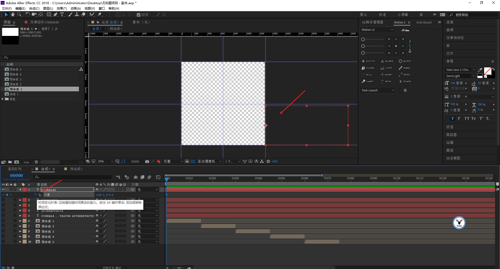 但是这样效率不高,这里我们就需要借助这个叫做Motion2的脚本,点击红色箭头处,可以直接通过面板上的指示来修改锚点位置,相当方便: