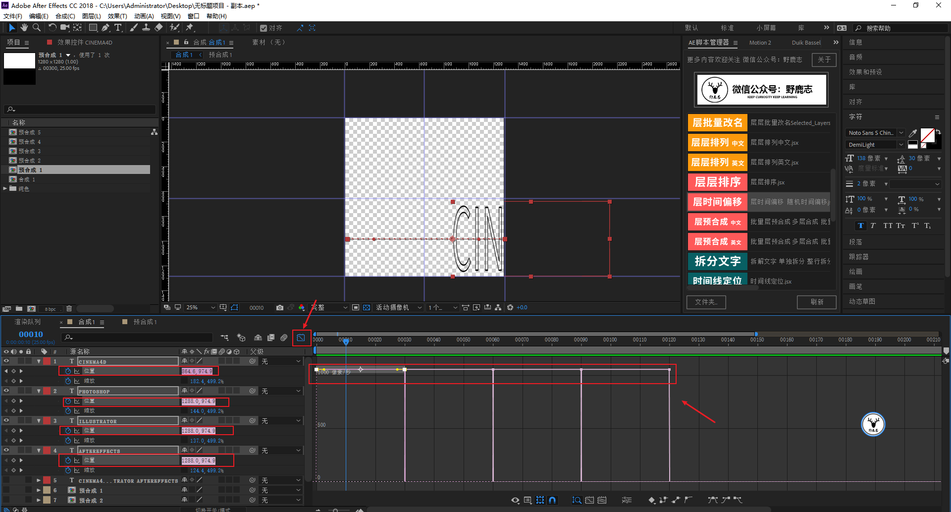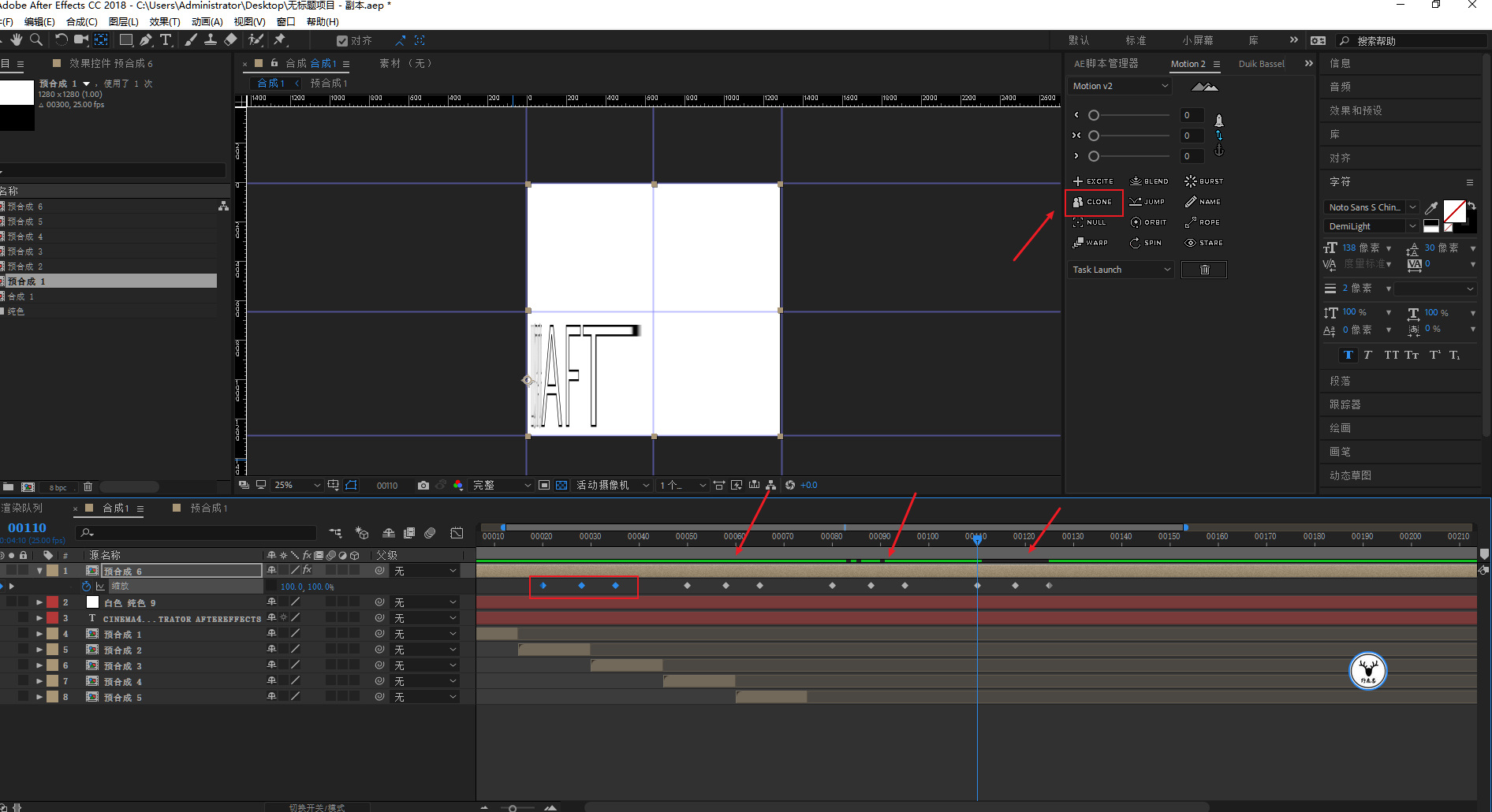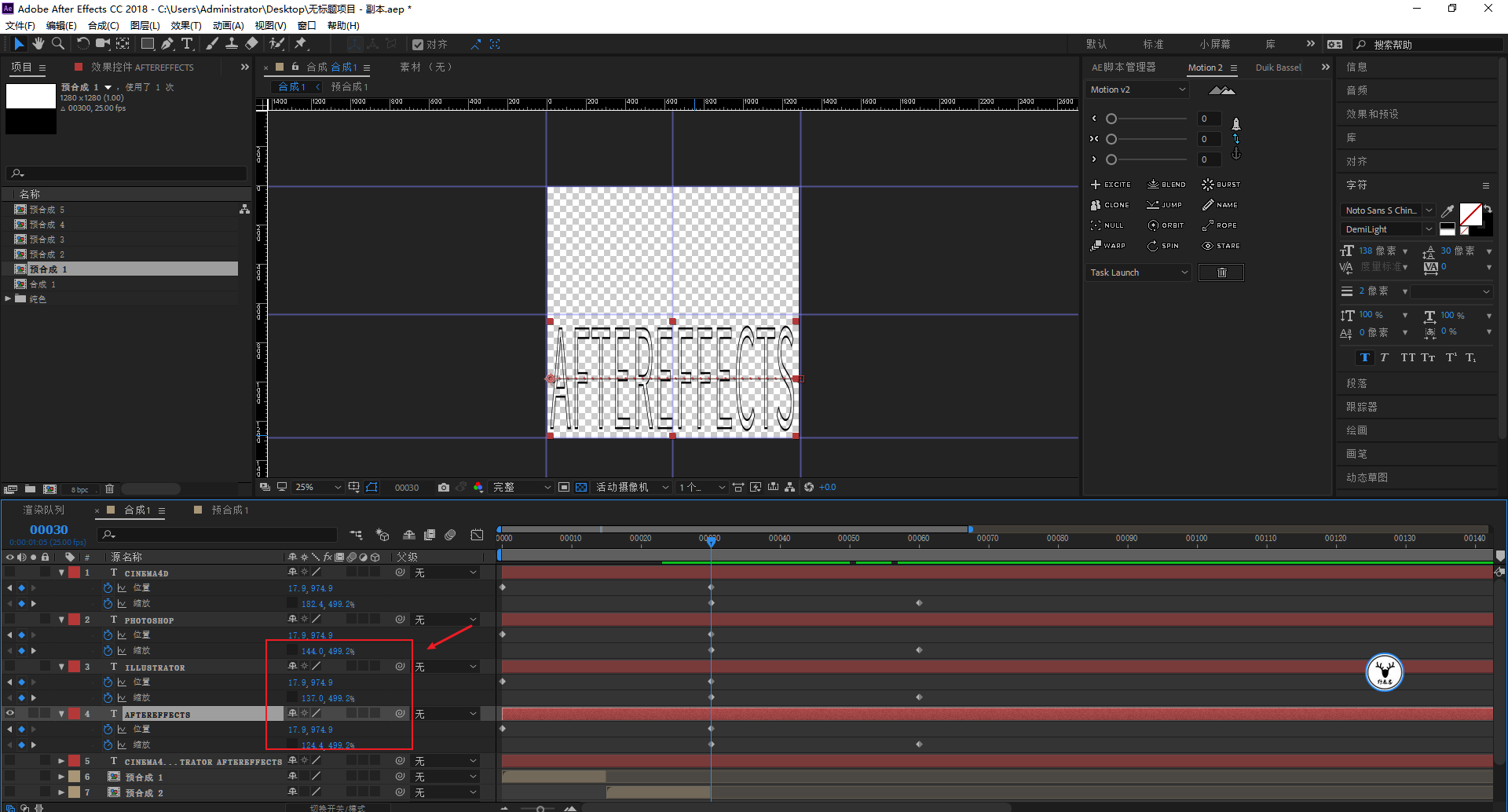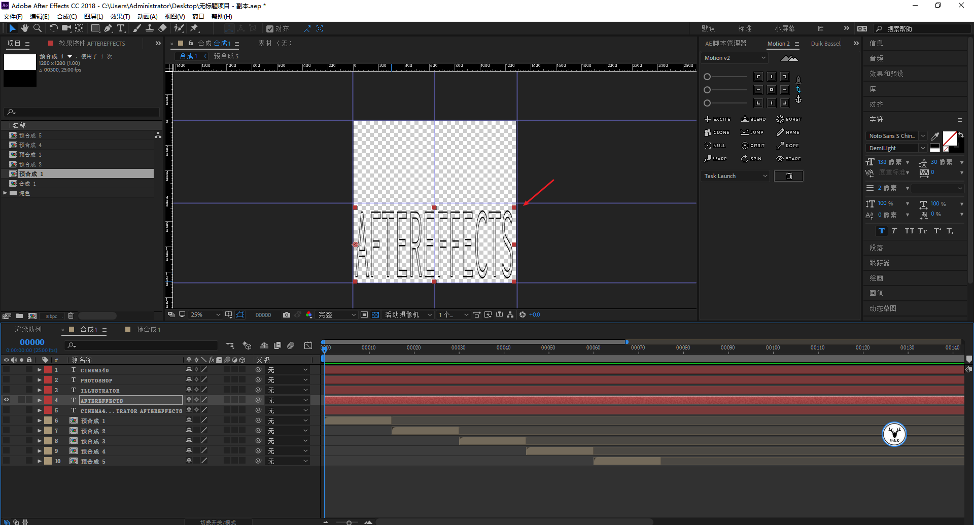 每组文字的缩放以及位移动画都做好以后,先把它们添加到一个新的预合成里: