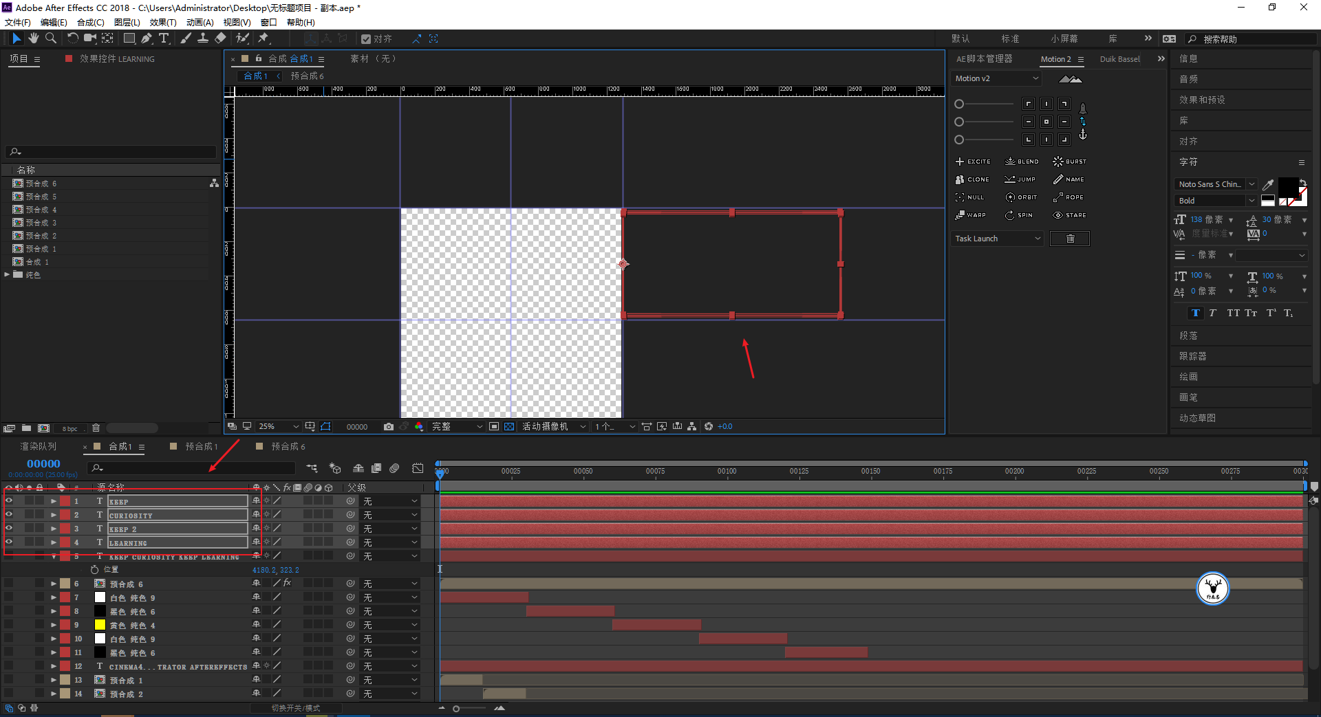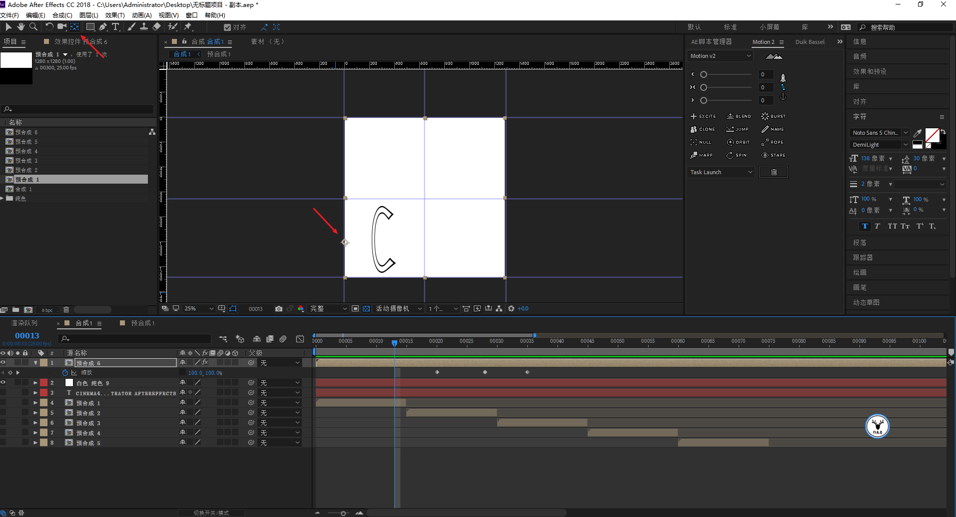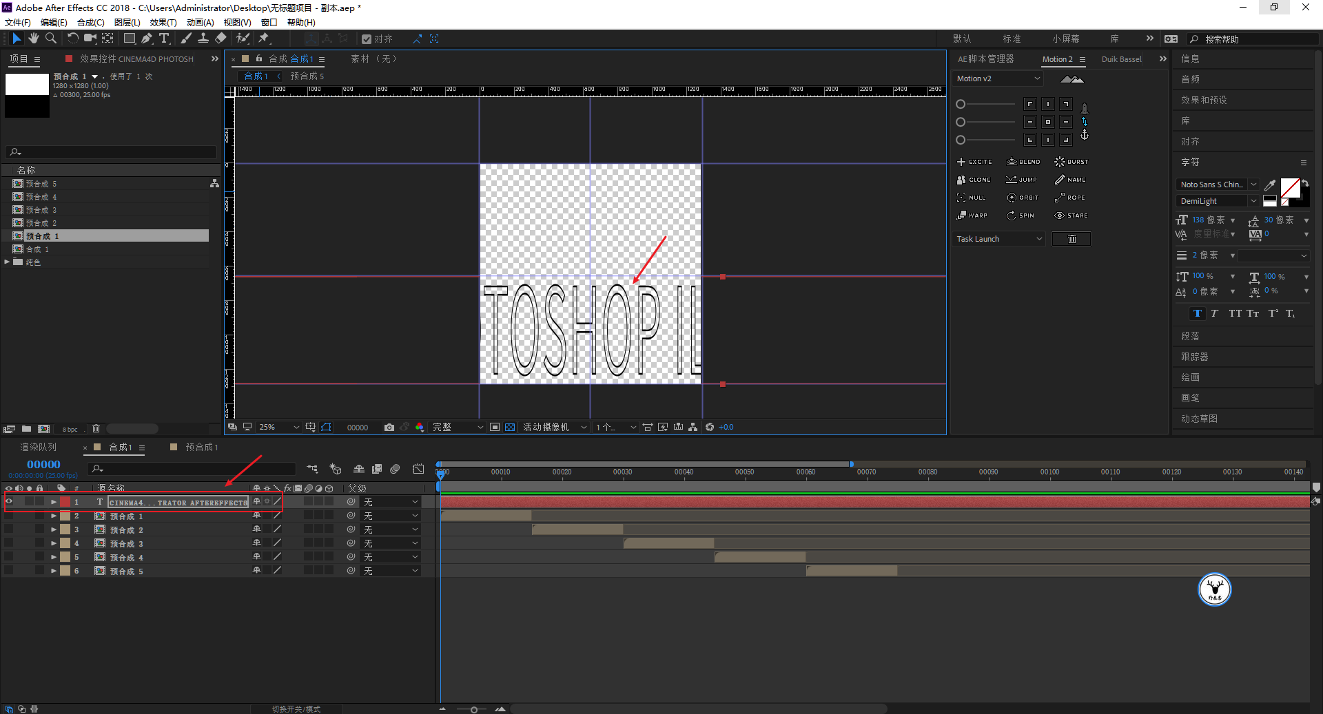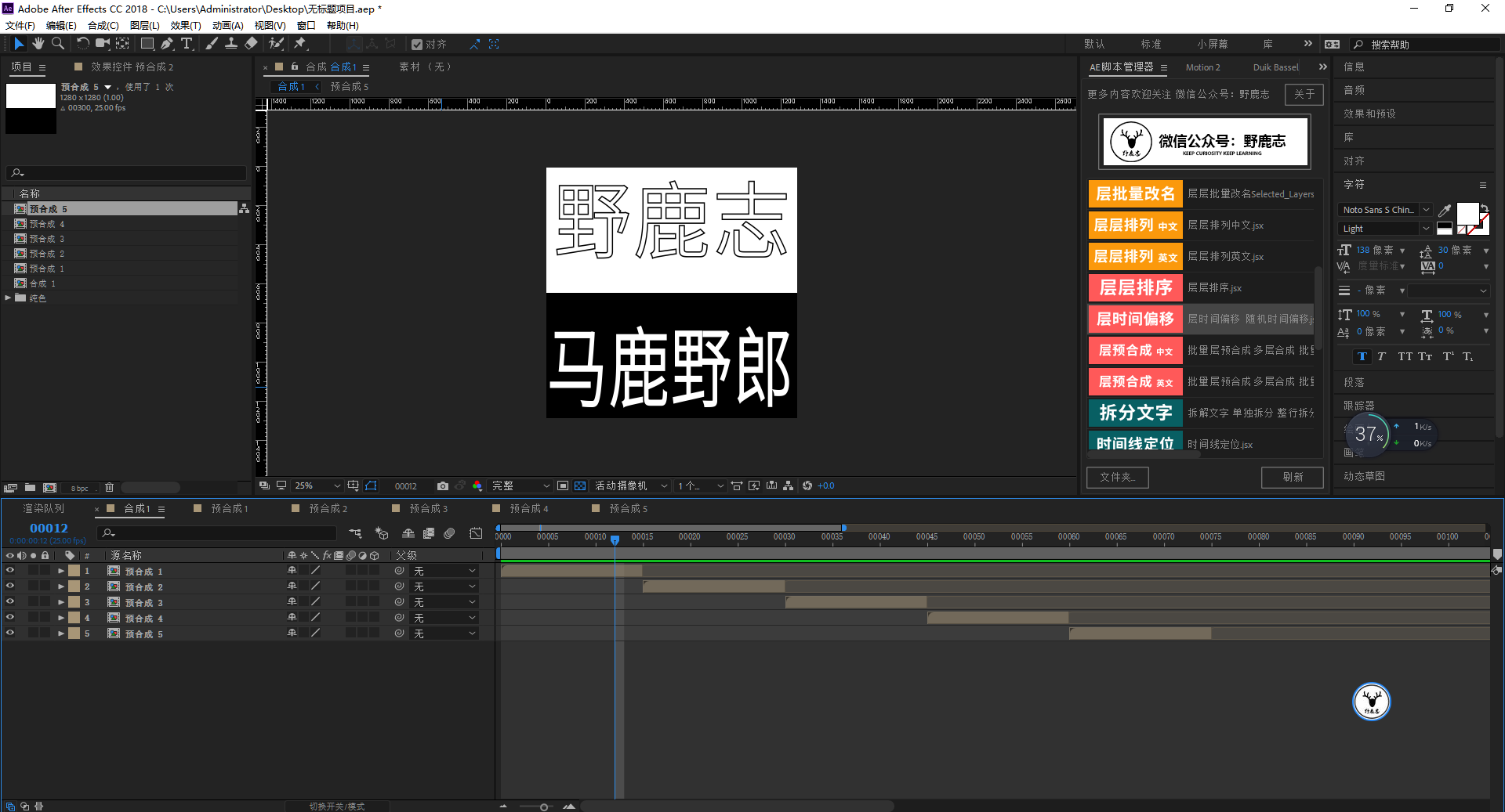 动画做好以后,选中所有图层,快捷键康秋加谢伏特加C,把他们添加到预合成里,这样第一个文字动画就做好了: