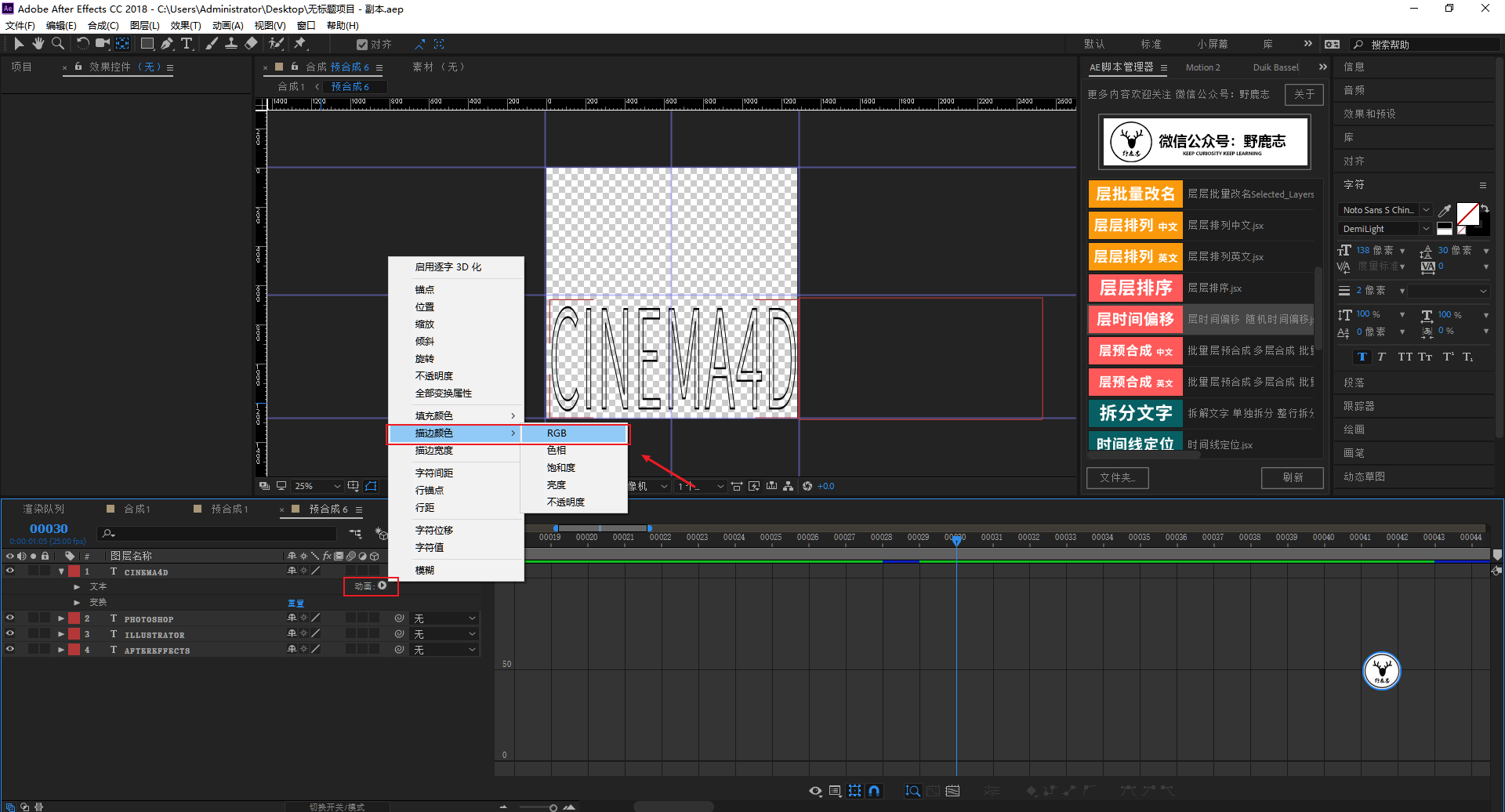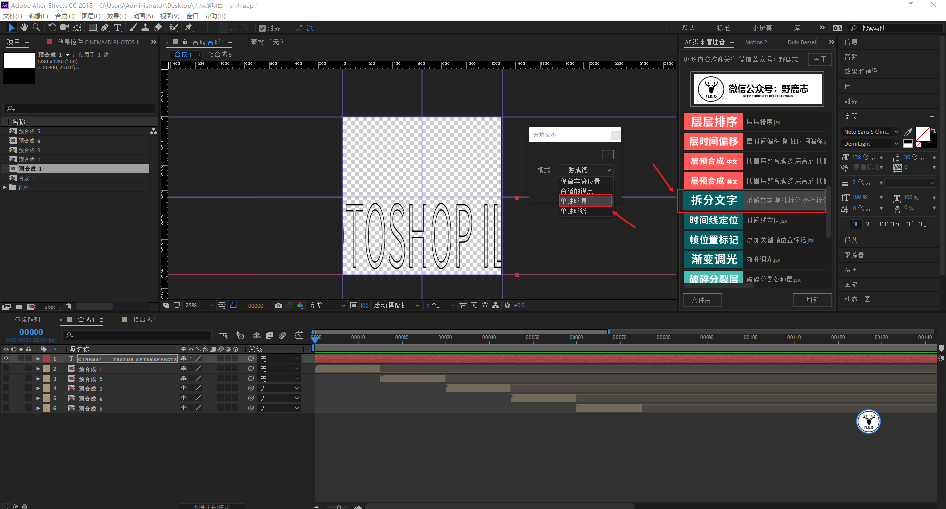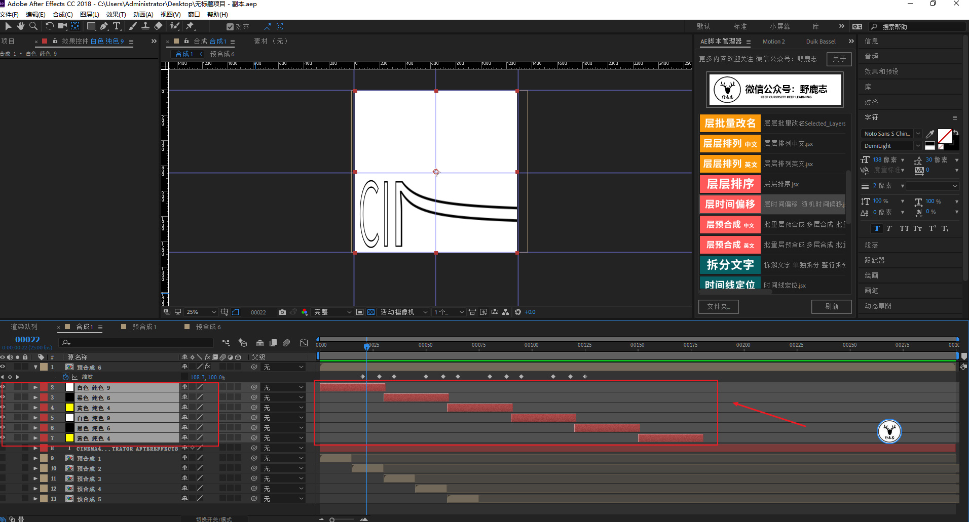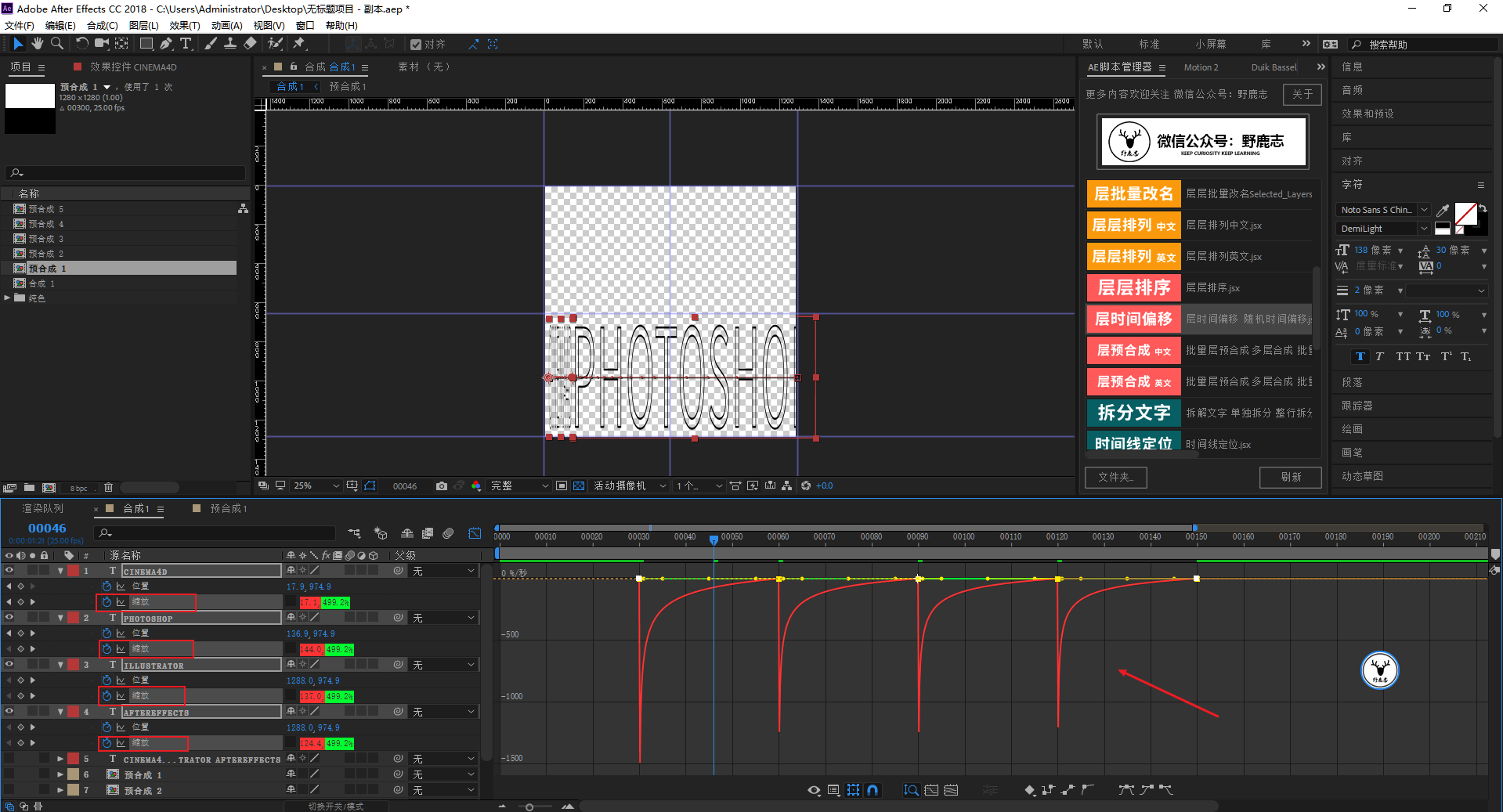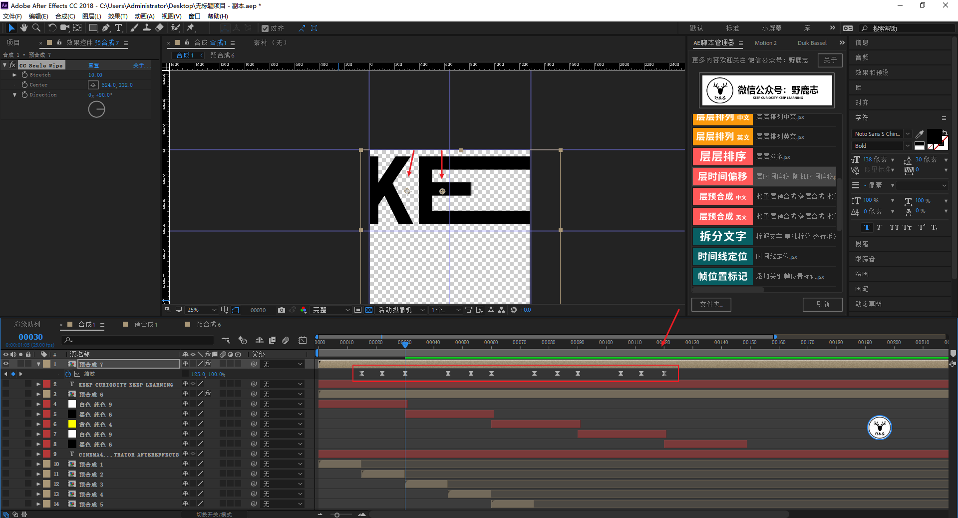 再选中所有词组用层时间偏移脚本统一向前偏移30帧: