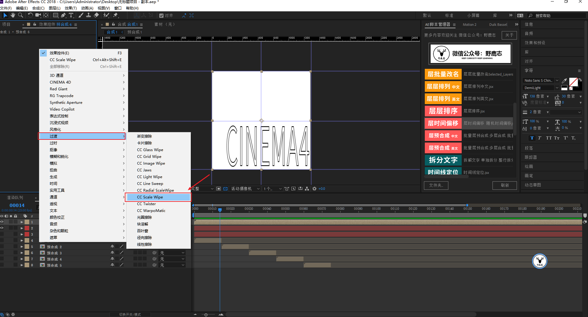 然后又挨个挨个的尝试,结果在过渡里找到了这个叫做CC Scale Wipe的效果,翻译成中文叫做尺度擦出: