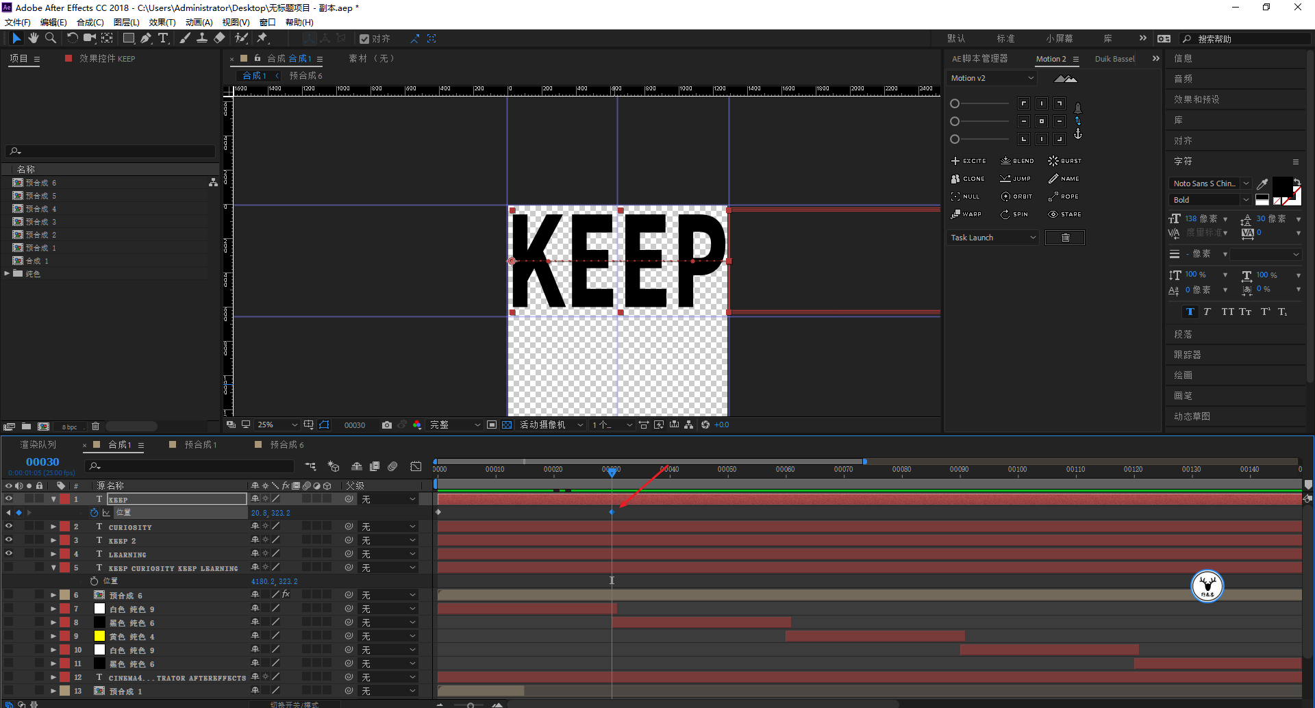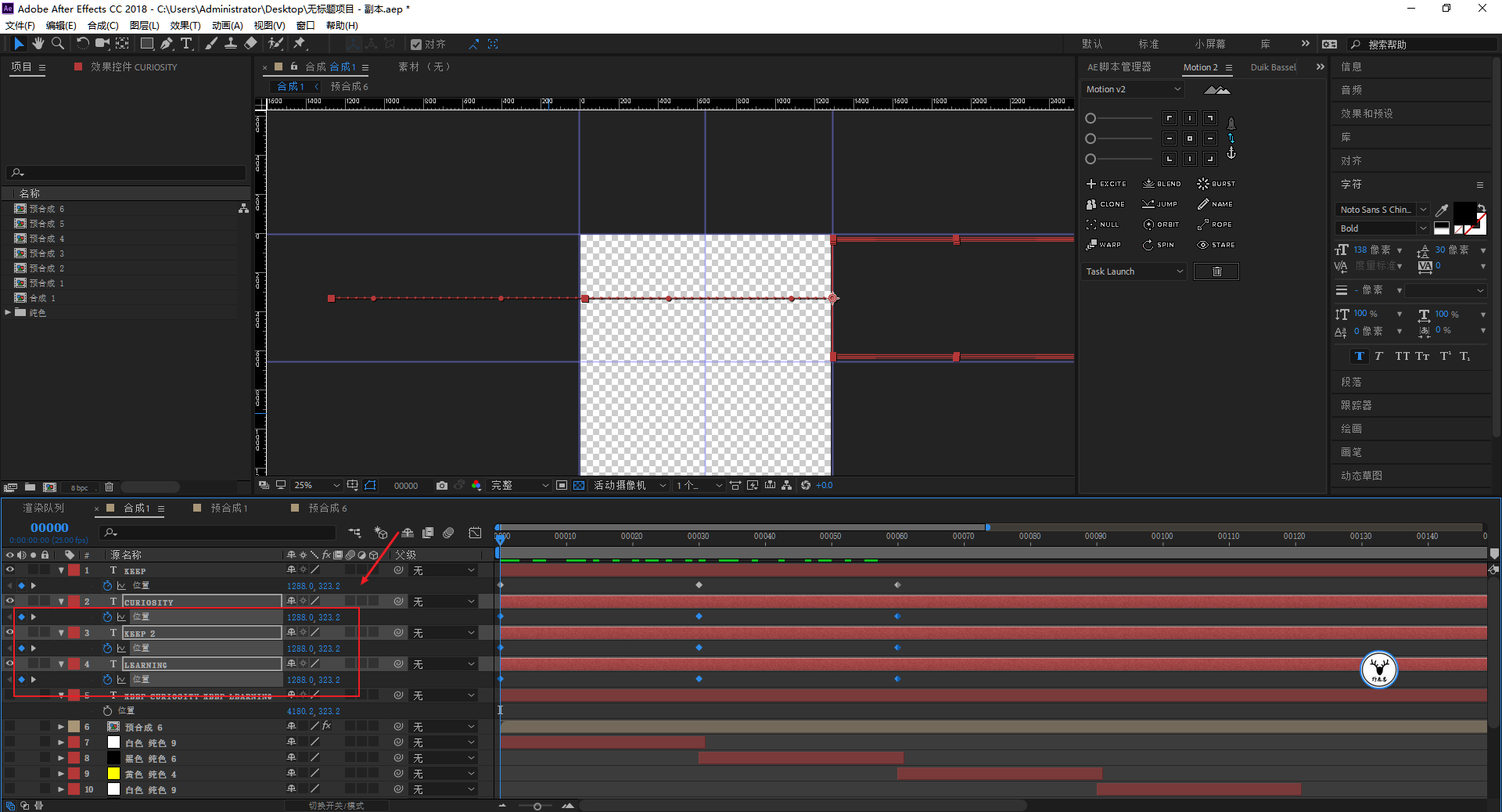 先做其中一组文字的位移动画吧,第0帧如图所示的位置位置,快捷键P键调出位置属性打上关键帧: