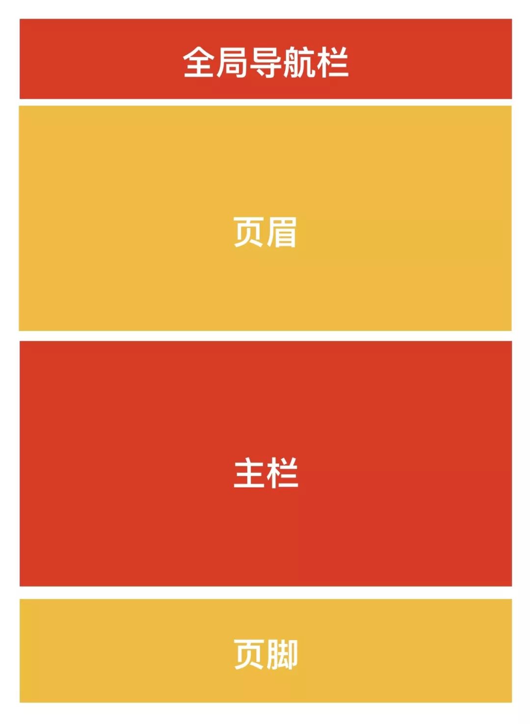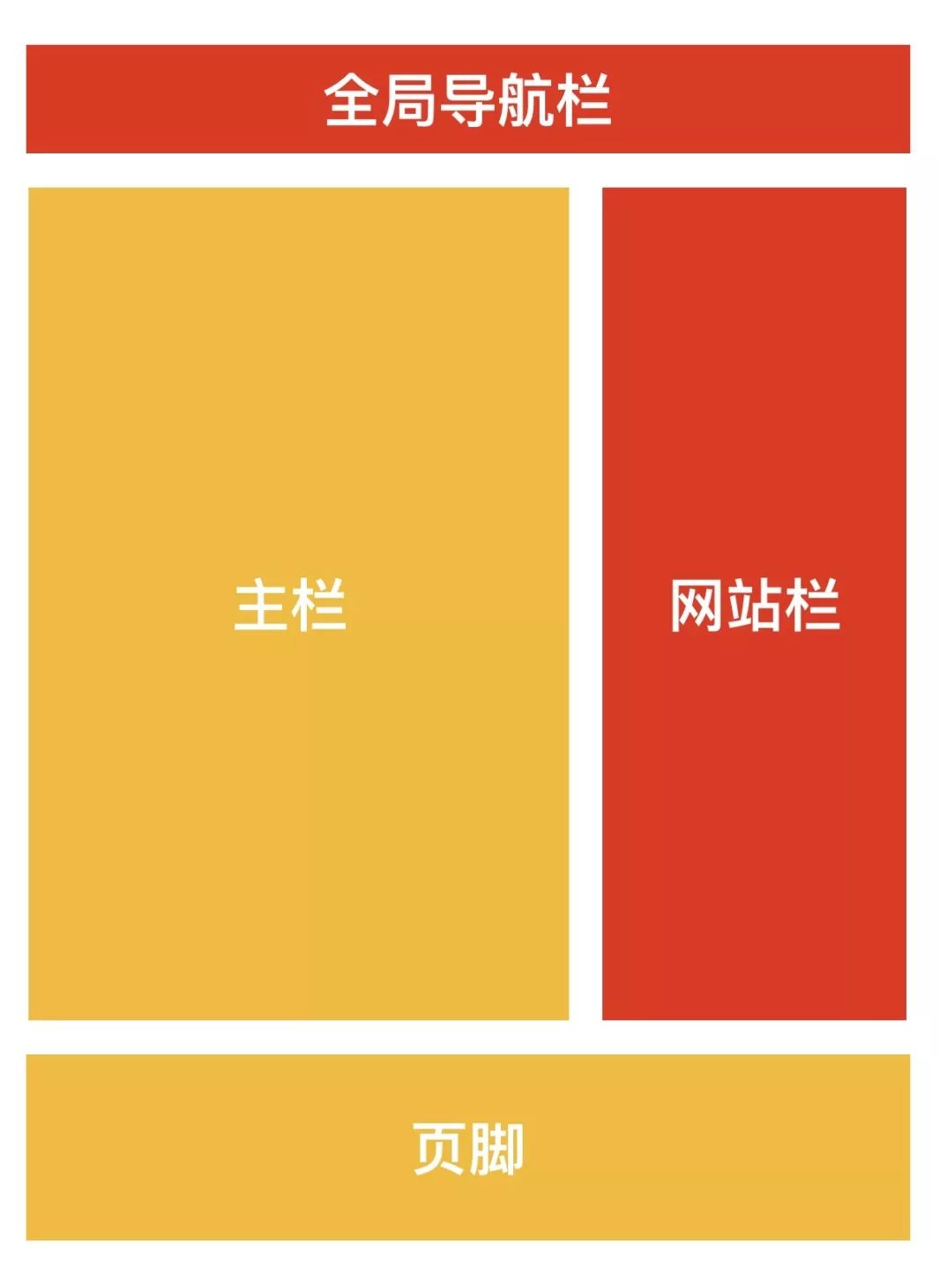 二级网页的结构,通常是由全局导航栏,主栏,网站栏和页脚组成。