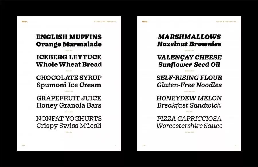 纽约字体公司Sharp Type 新发行的Beatrice,以传统American Gothic 为基底,将字距拉紧,Beatrice 字型家族提供许多字重选择,其中包括了高对比度、字距紧密的Beatrice Display(下图左) ,以及标准低对比度的字体。