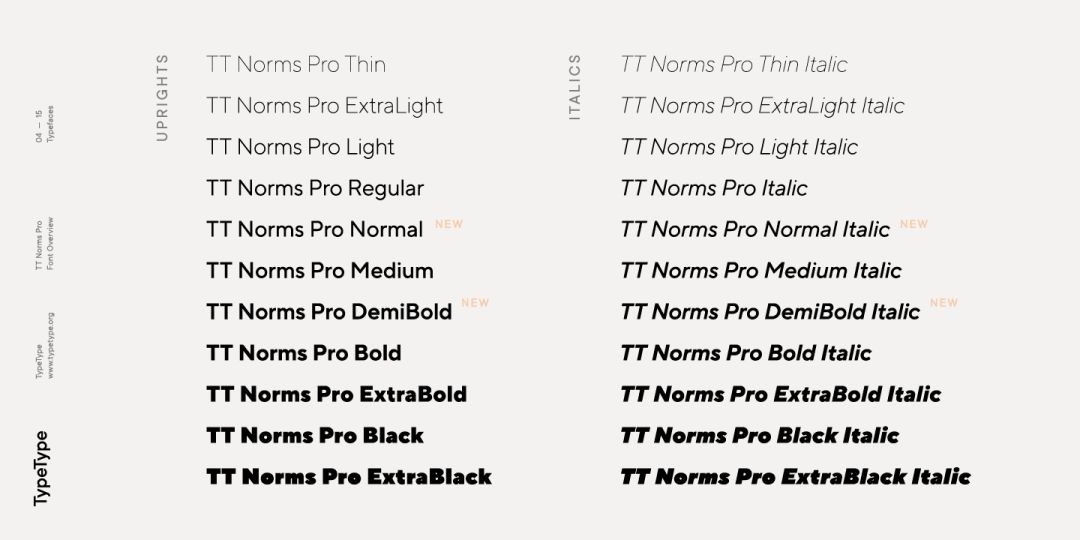 总共有9种字重和5种宽度(width)可供选择,以上皆配有斜体。在charactertype.com可以下载NewsSans免费试用版。