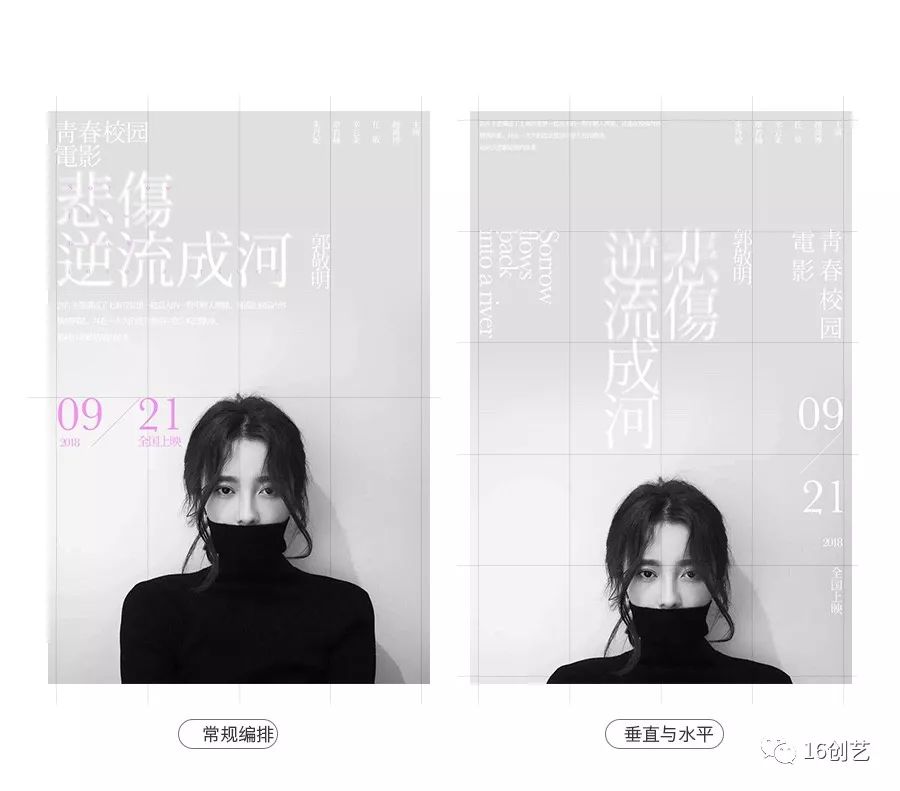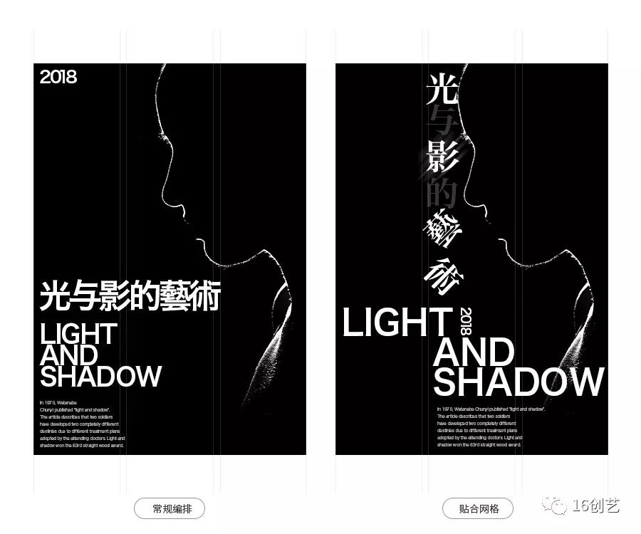 在同样的网格划分下,适当的对内容进行调整之后可以看出,整体的画面表现和视觉感受发生了翻天覆地的变化,并不是因为文字的效果和形式,而是通过调整版面的结构布局,使信息贴合垂直网格划分的结构,遵循并强调突出以划分方式形成的视线,使版面以更加直观的视觉表现呈现出信息和主干结构,而手法和效果则是为了满足结构布局进行的适当调整。